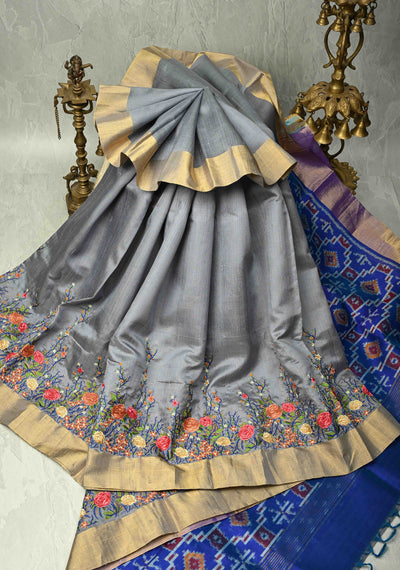 Gray Pure Raw Silk Saree with Cross Stitch Floral Embroidery and Ikkat Pallu, Blouse Piece | SILK MARK CERTIFIED