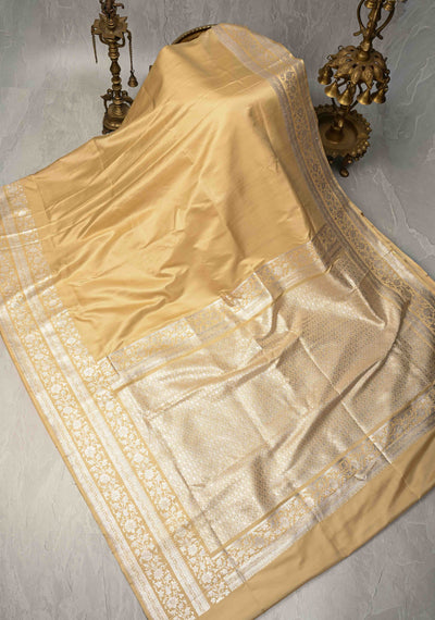 Light Cream Tanchoi Banarasi Satin Silk Saree with Floral Brocade | SILK MARK CERTIFIED