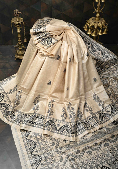 Beige Desi Tussar Madhubani Hand-Painted Saree | SILK MARK CERTIFIED