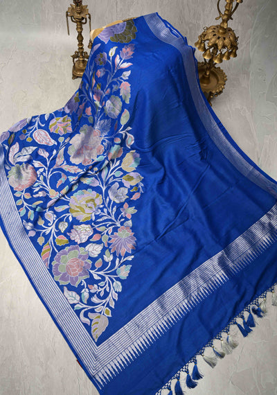 Royal Blue Tussar Georgette Saree with Meenakari Floral Jaal and Temple Zari Border | SILK MARK CERTIFIED