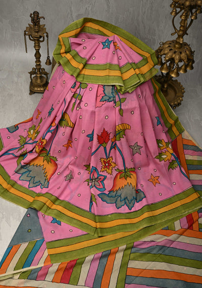 Floral Theme : Pink Authentic Pen Kalamkari on Cotton Saree