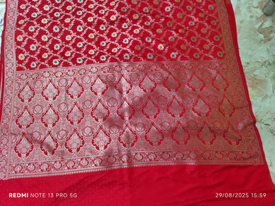 Dupatta: Authentic Bandhej Banarasi Pure Silk Georgette Bright Red Dupatta with Jaal Zari & Peacock Meenakari Pallu | SILK MARK CERTIFIED