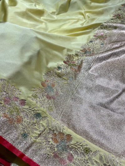 Butter Yellow Semi Mashru Banarasi Silk Saree with Meenakari hand Brush Dye on Zari Borders