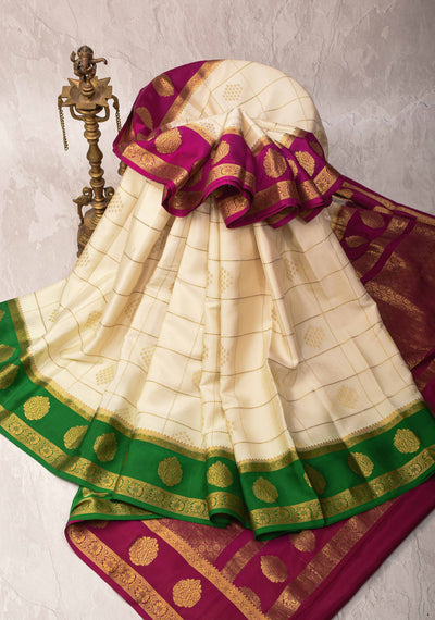 Off White Pure Mysore Crepe Silk Zari Checks Saree with Ganga Jamuna Borders | SILK MARK CERTIFIED