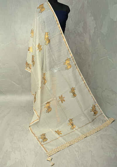Ivory Chanderi Silk Cotton Dupatta with Sona Rupa Pichwai Foil Print and Banarasi Brocade Border