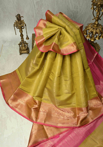 Sage Green Kanjivaram Tissue Semi Silk Saree with Floral Brocade Jaal and Contrast Wide Zari Border