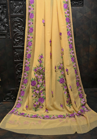 Butter Yellow Kashmiri Aari Georgette Saree with Floral Embroidery