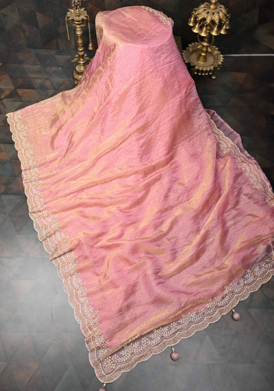 Champagne Tissue Organza Saree with Stone, Cutdana work Jaal and Scallop Border