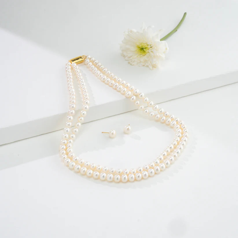 Elegant Freshwater Cultured Pearl necklace crafted with perfectly round white pearls measuring 6-7mm in size. Featuring two rows of luminous pearls, this necklace measures 18 inches in length and weighs approximately 78.100 grams, giving it a rich and graceful look. With its AAA quality grading, it radiates exceptional luster and refinement. Backed by a life-long guarantee on pearls, this timeless piece is designed to last for generations. Ideal for weddings, formal occasions, and festive gatherings, it pairs beautifully with both traditional and contemporary attire