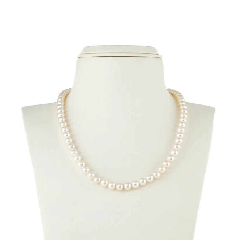 Classic and timeless, this single-row freshwater cultured pearl necklace is crafted with AAA quality round pearls sized 7.0-8.0mm. The pristine white pearls showcase an exceptional natural luster and smooth finish, making it a graceful piece for any jewelry collection. At 18 inches, it sits elegantly at the neckline, perfect for both everyday sophistication and special occasions. Backed by a life-long guarantee on pearls, this necklace is a symbol of elegance, tradition, and lasting beauty.