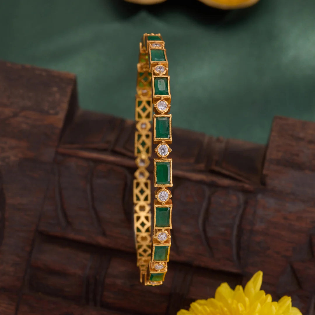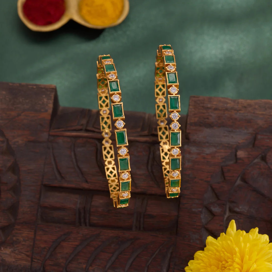 Crafted with precision, the Greenvine Bangles showcase a striking Rectangular design embellished with vibrant Emeralds and sparkling Cubic Zirconia stones. This combination creates a sophisticated look that balances rich colour and brilliance, making these bangles an exquisite choice for both formal occasions and everyday elegance. The expert craftsmanship ensures durability while highlighting the beauty of each stone, offering a timeless accessory that enhances any ensemble.