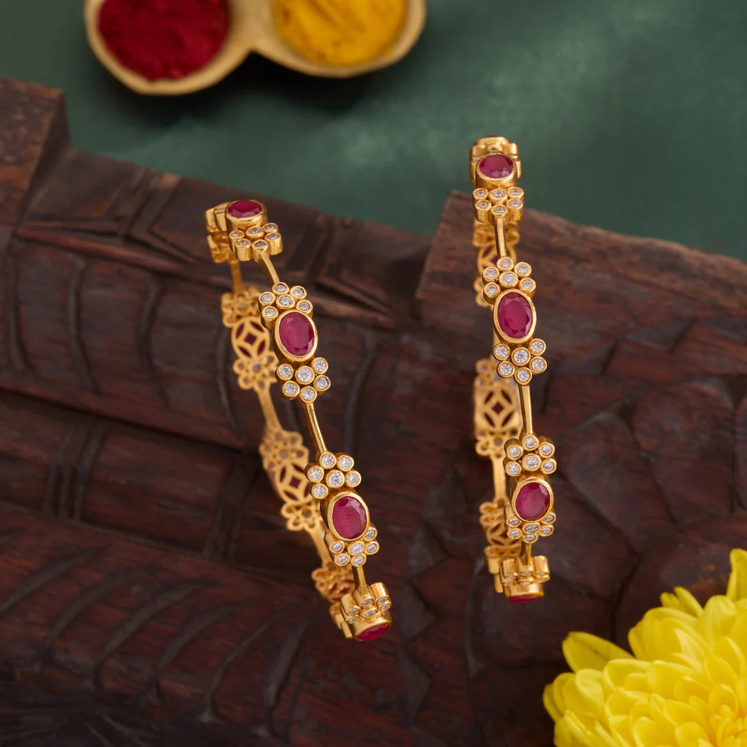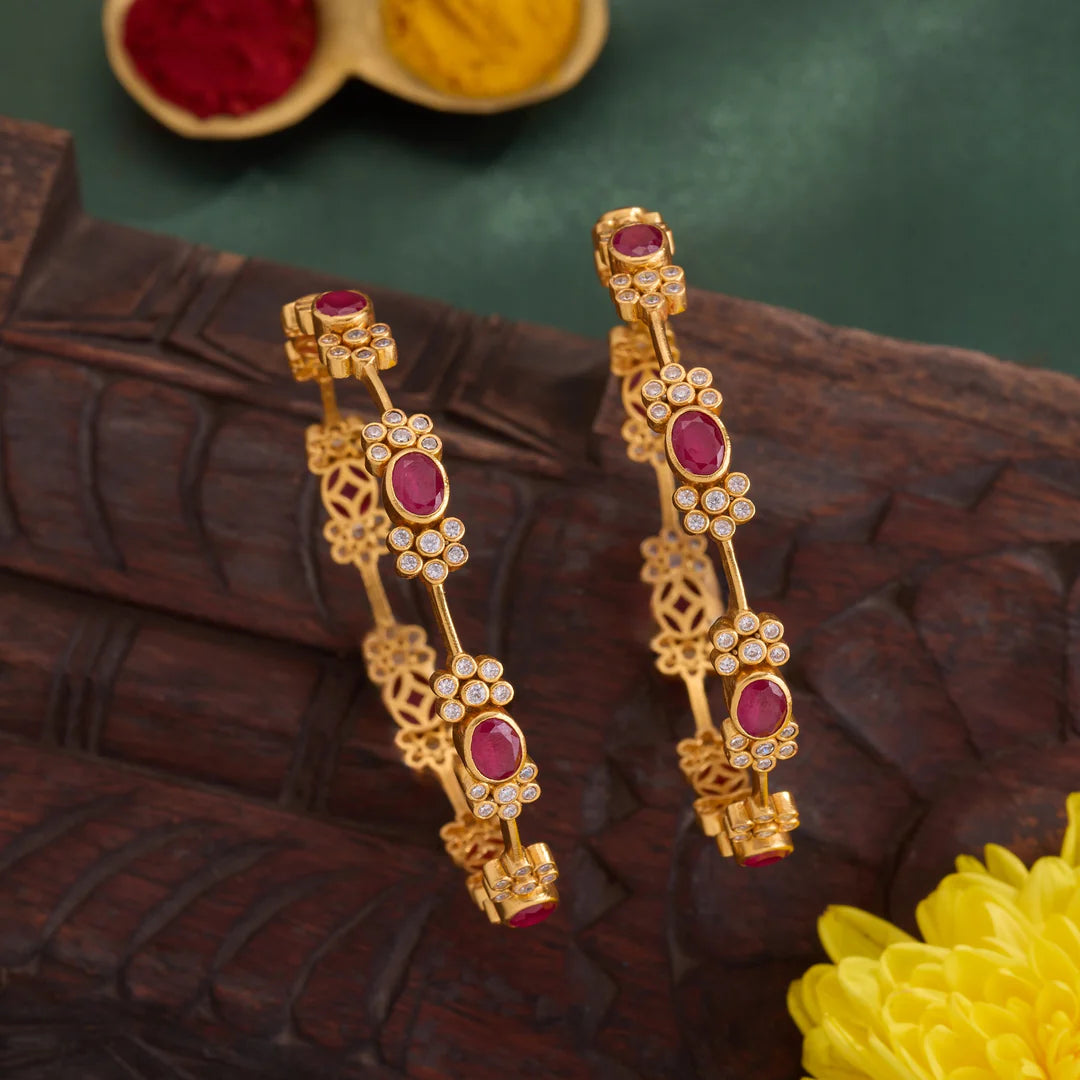 The Phool of Oval Bangles showcases an expert design featuring Oval-shaped Rubies arranged in an elegant Floral pattern, accentuated by sparkling Cubic Zirconia stones. This combination enhances both the richness of the Rubies and the intricate detailing of the Floral motif, offering a refined accessory that adds a sophisticated charm to any ensemble.