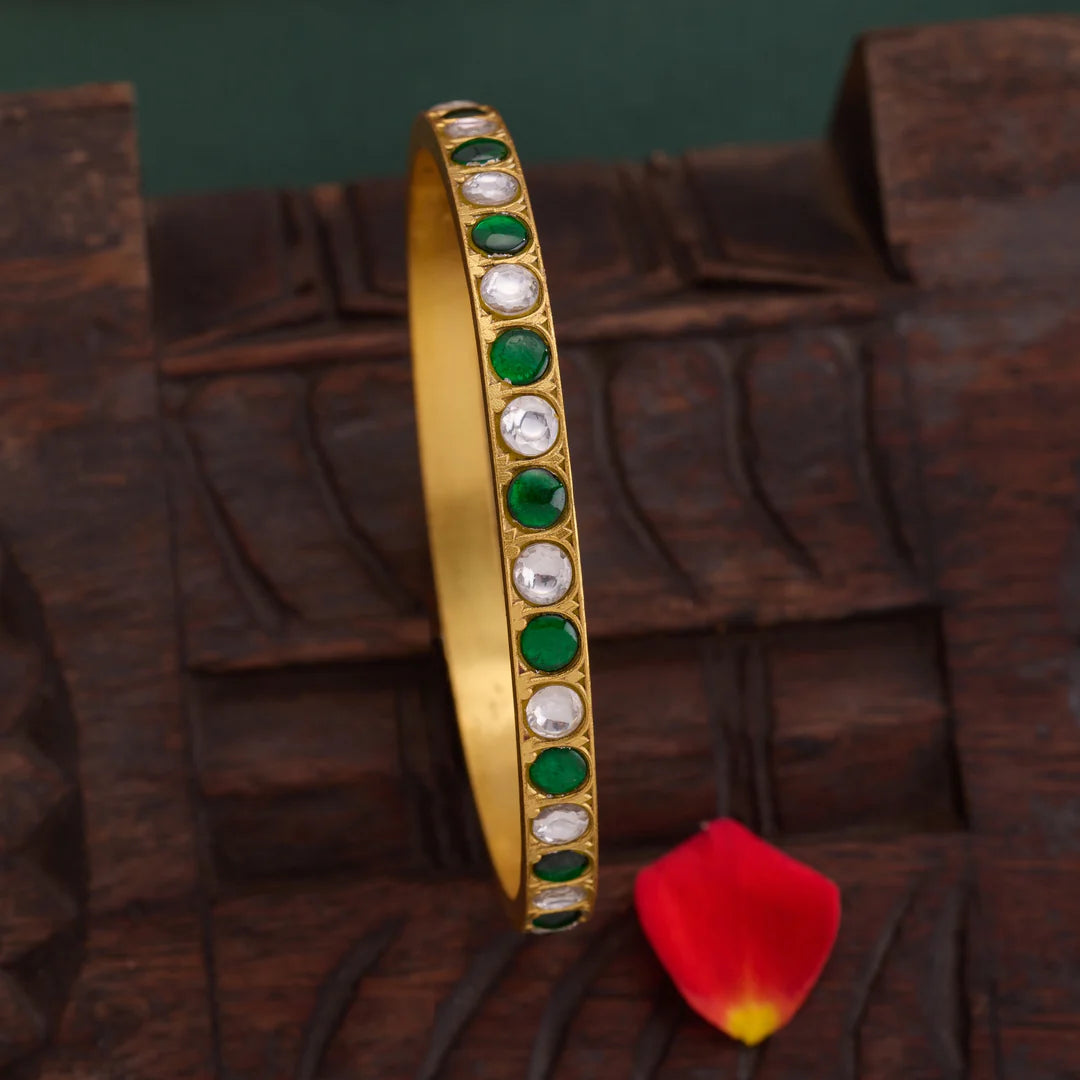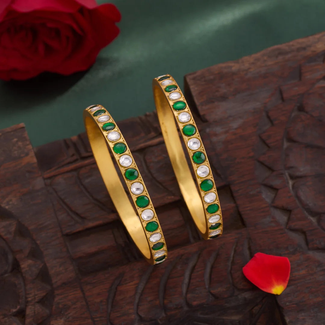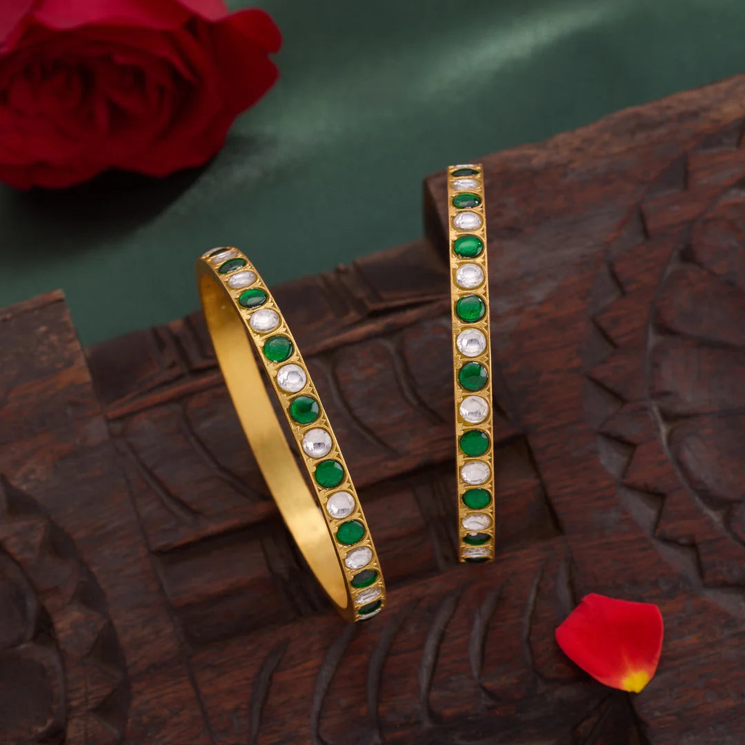 Rondiya Bangles showcase a beautifully crafted round design embellished with intricate Kundan work. These bangles blend traditional artistry with elegant form, making them perfect for adding a refined touch to any ensemble. Their detailed Kundan accents enhance the bangles' timeless appeal, ideal for both festive occasions and sophisticated everyday wear.