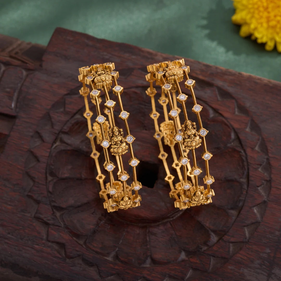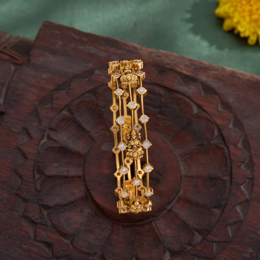 Shree Trayi Bangles feature a sophisticated design with three distinct lines adorned with intricate Lakshmi motifs embellished with sparkling CZ stones. These bangles combine traditional elegance with modern craftsmanship, making them a perfect accessory to enhance any outfit with refined style and subtle brilliance.
