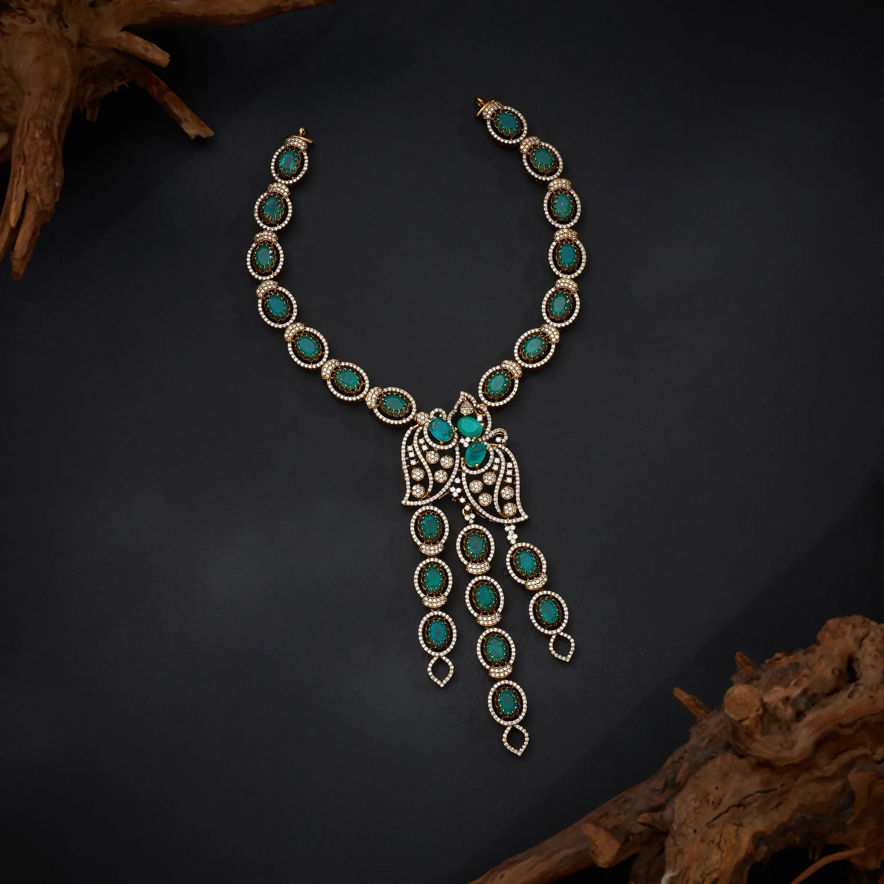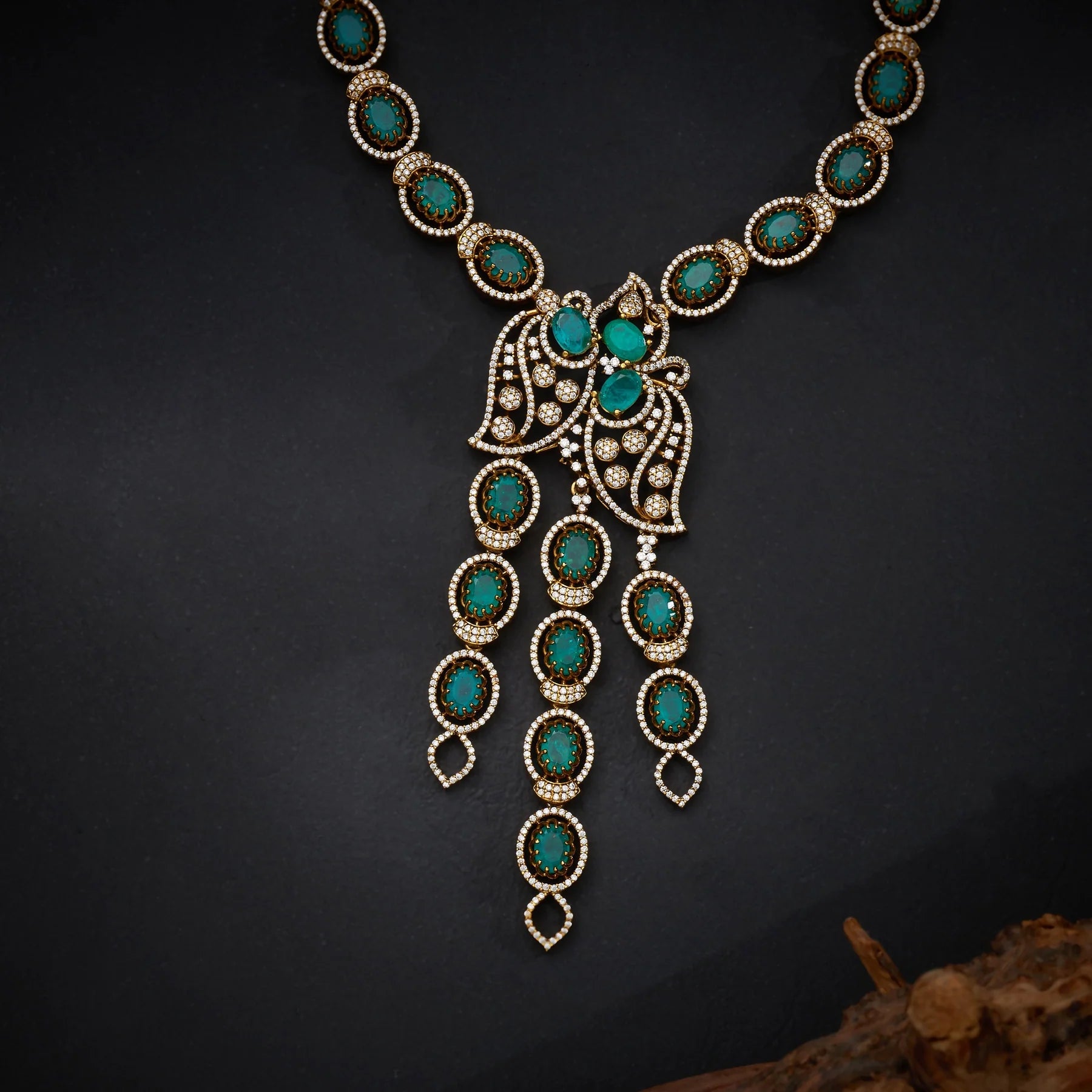 Emeravalli Victorian Necklace features intricate Mango-shaped motifs adorned with Oval Emeralds and sparkling Cubic Zirconia stones. This piece combines traditional design elements with timeless elegance, showcasing the craftsmanship of Victorian-inspired jewellery. The Emerald stones add a touch while the CZ accents enhance brilliance and visual depth. Perfect for those who appreciate classic aesthetics with a contemporary edge, this necklace makes a sophisticated statement for special occasions wear.