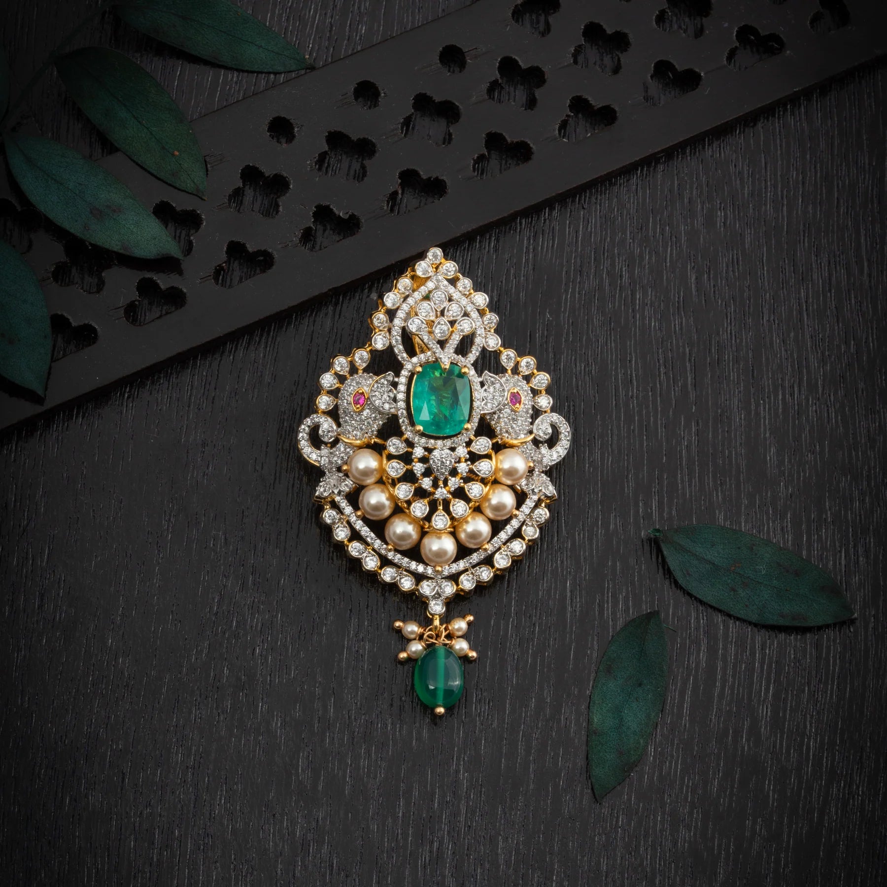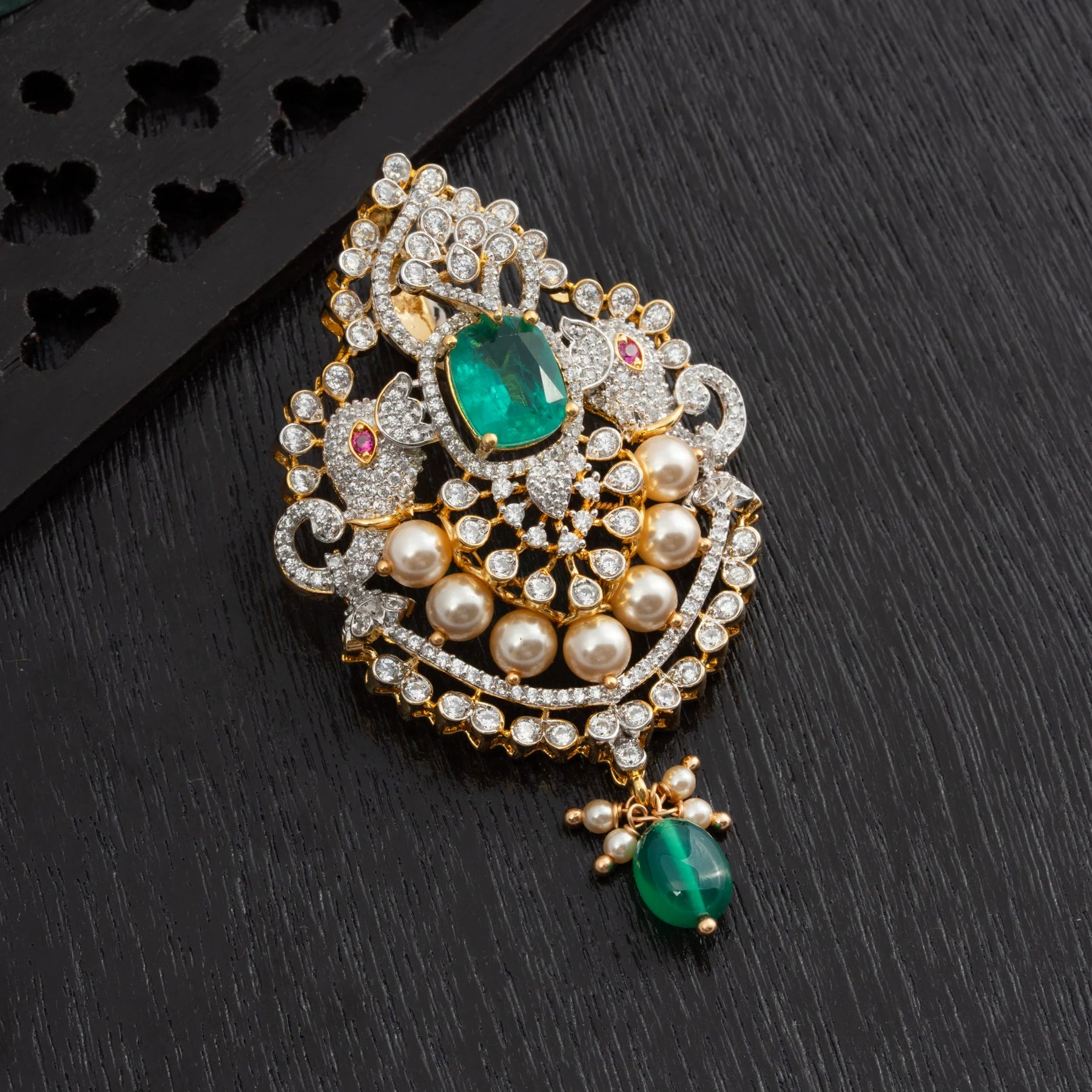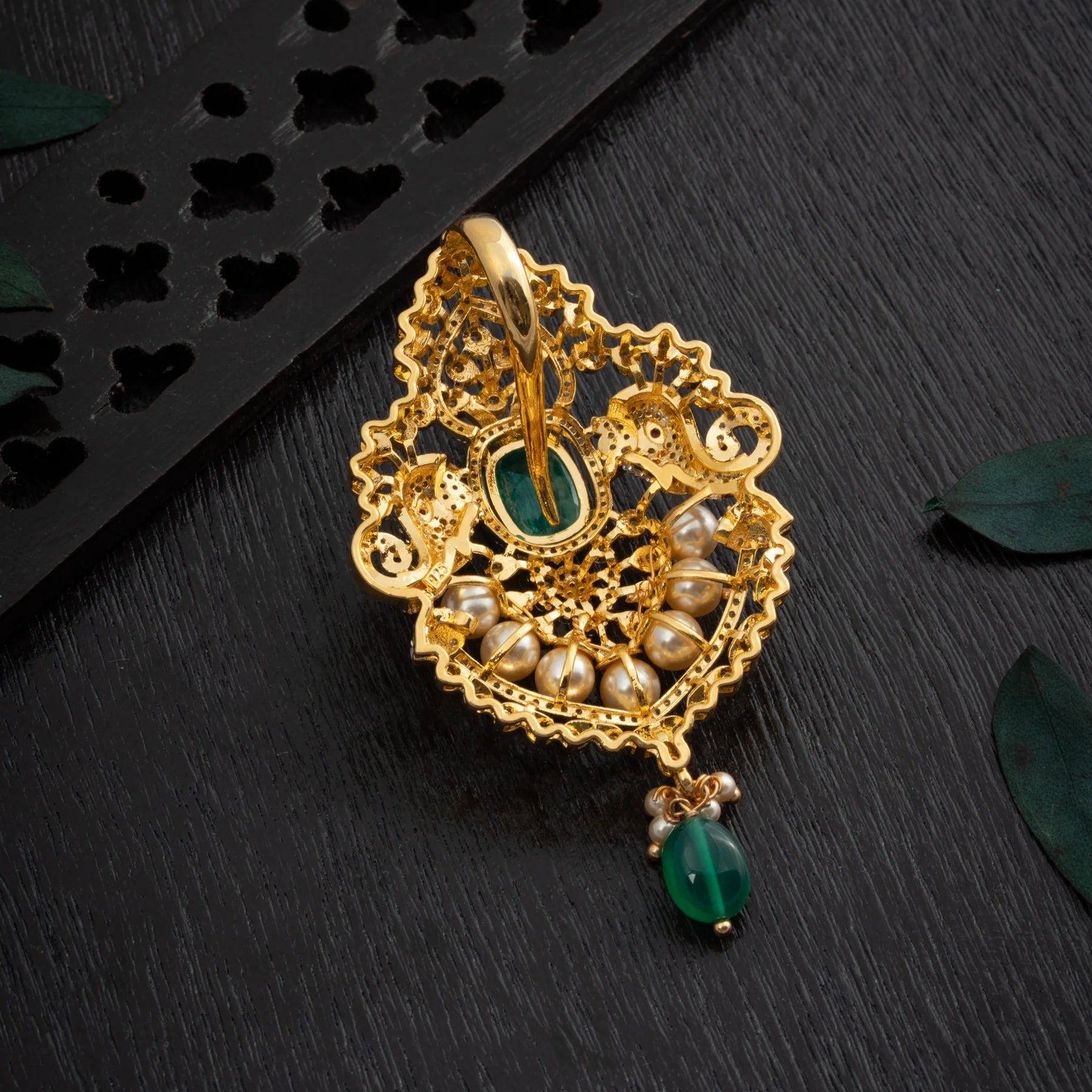 Shrevara Temple Pendant features an exquisite design inspired by the divine presence of Goddess Lakshmi, meticulously crafted with brilliant Cubic Zirconia stones that capture light with exceptional clarity. Delicate Pearl hangings cascade gracefully from the pendant, adding movement and timeless elegance to this spiritual piece. The combination of sacred symbolism and refined gemstone work makes this pendant a meaningful addition to your collection, suitable for both devotional wear and special occasions