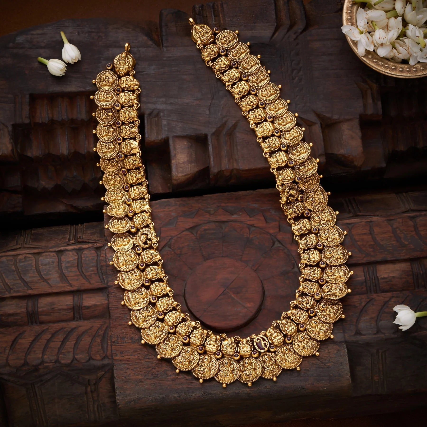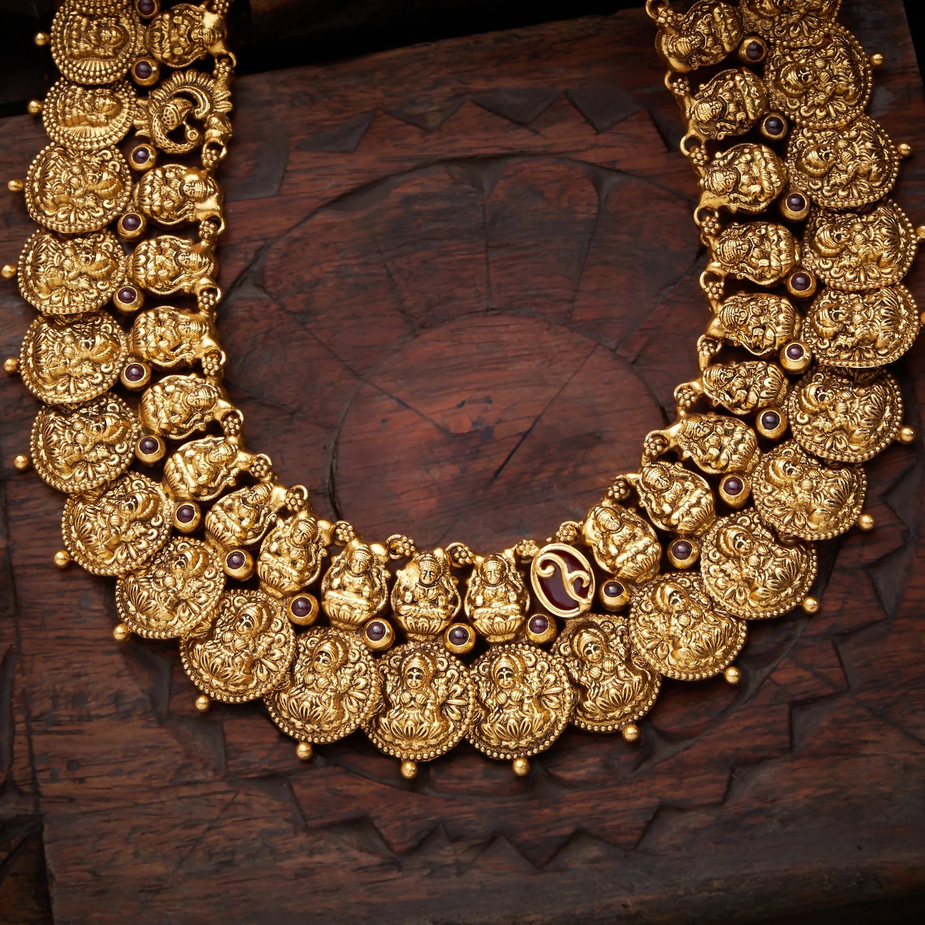 Lakshmi Kasu Temple Necklace This exquisite temple necklace features a coin-shaped pendant inspired by traditional Lakshmi iconography, meticulously crafted with intricate motifs celebrating the goddess of prosperity. The design incorporates rich Ruby accents that enhance the sacred symbolism, creating a piece that honours both spiritual heritage and refined craftsmanship. Perfect for those seeking authentic temple jewellery that combines devotional significance with timeless elegance, this necklace serves as a meaningful addition to your collection or a thoughtful gift for special occasions..