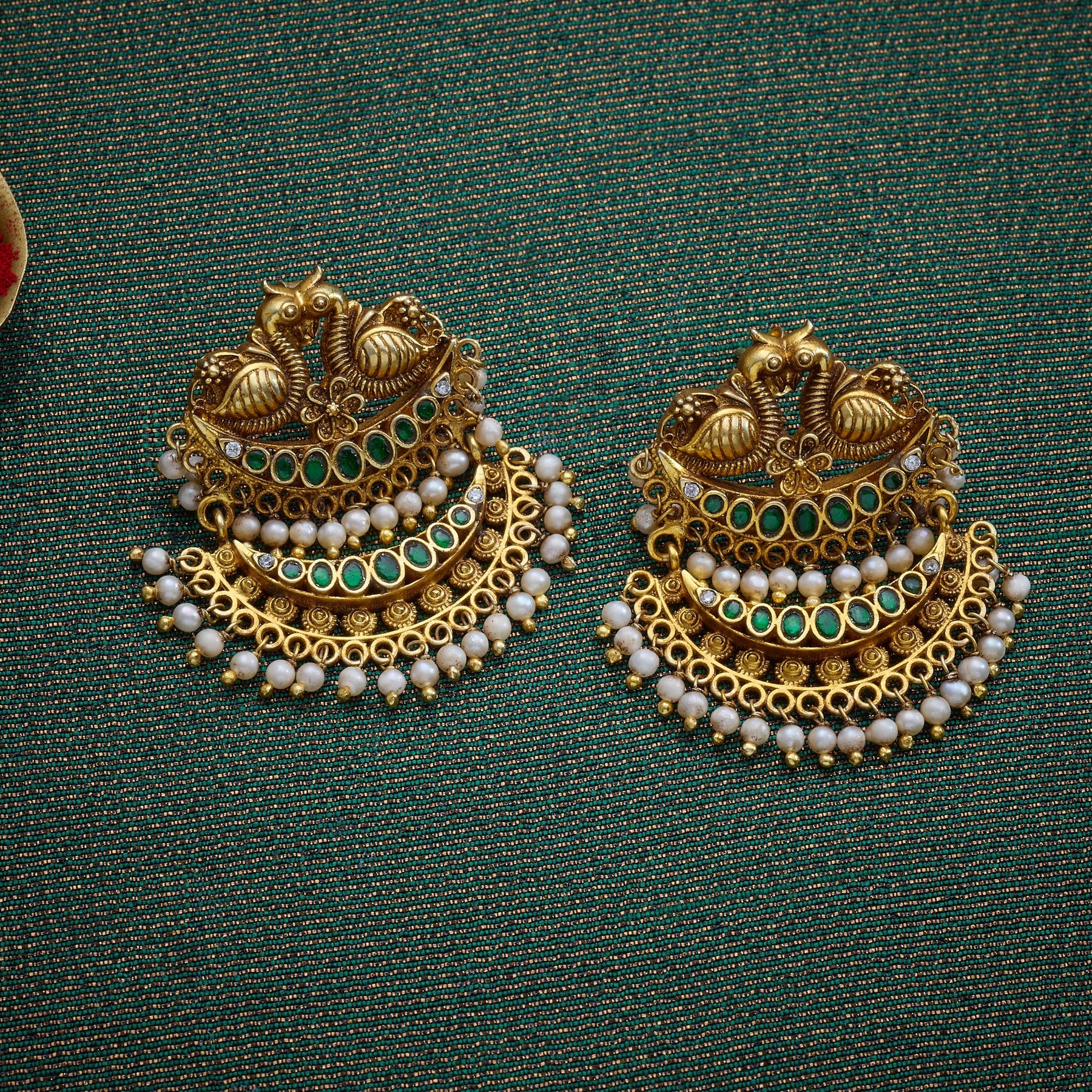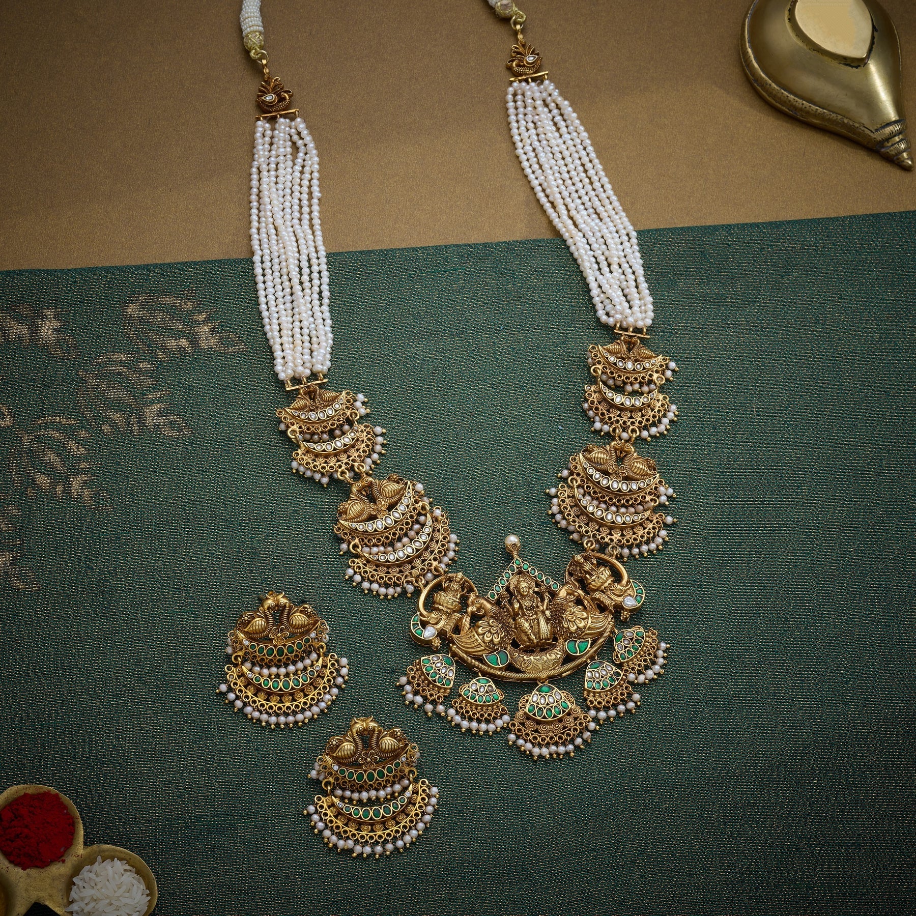 Elevate your festive ensemble with the Lakshmi Temple Necklace Set, a masterpiece that seamlessly blends traditional craftsmanship with timeless elegance. This exquisite piece features intricate Lakshmi and Swan motifs, symbolizing prosperity and grace, meticulously adorned with Kundan settings that catch light with every movement. Lustrous Pearl beads and delicate drops complete the design, creating a sophisticated silhouette perfect for weddings, celebrations, and special occasions. Each element is thoughtfully positioned to enhance the necklace's regal appeal while maintaining authentic temple jewellery aesthetics. A versatile investment piece that transcends seasons and trends.