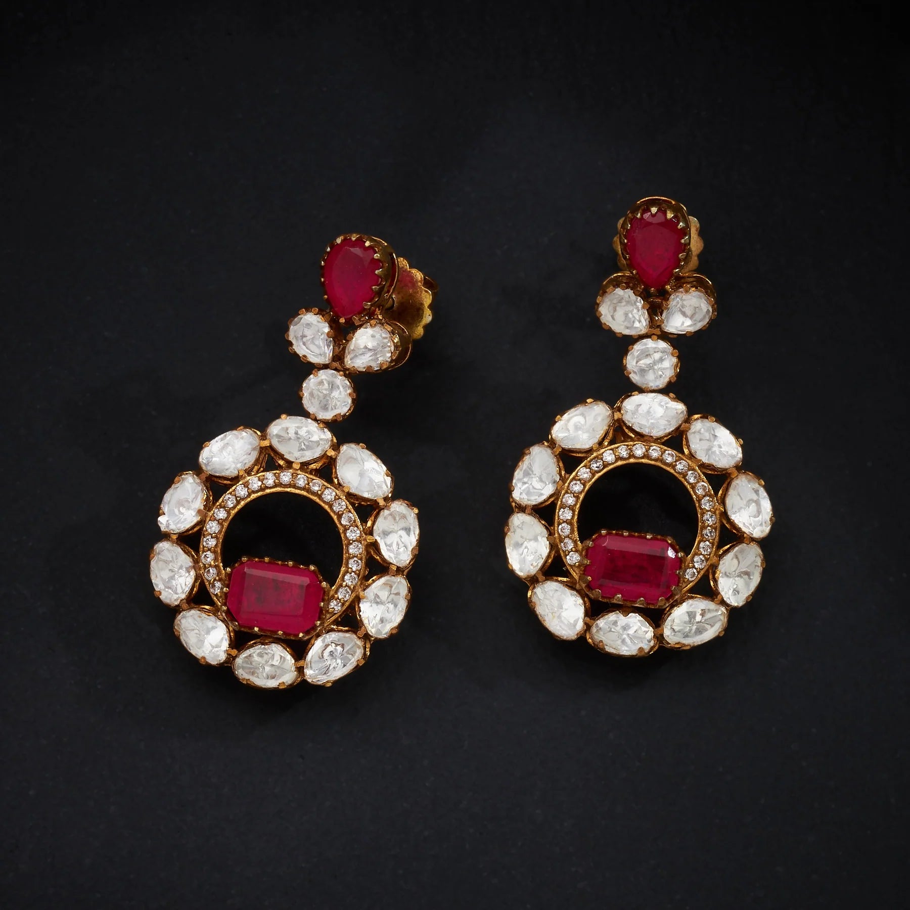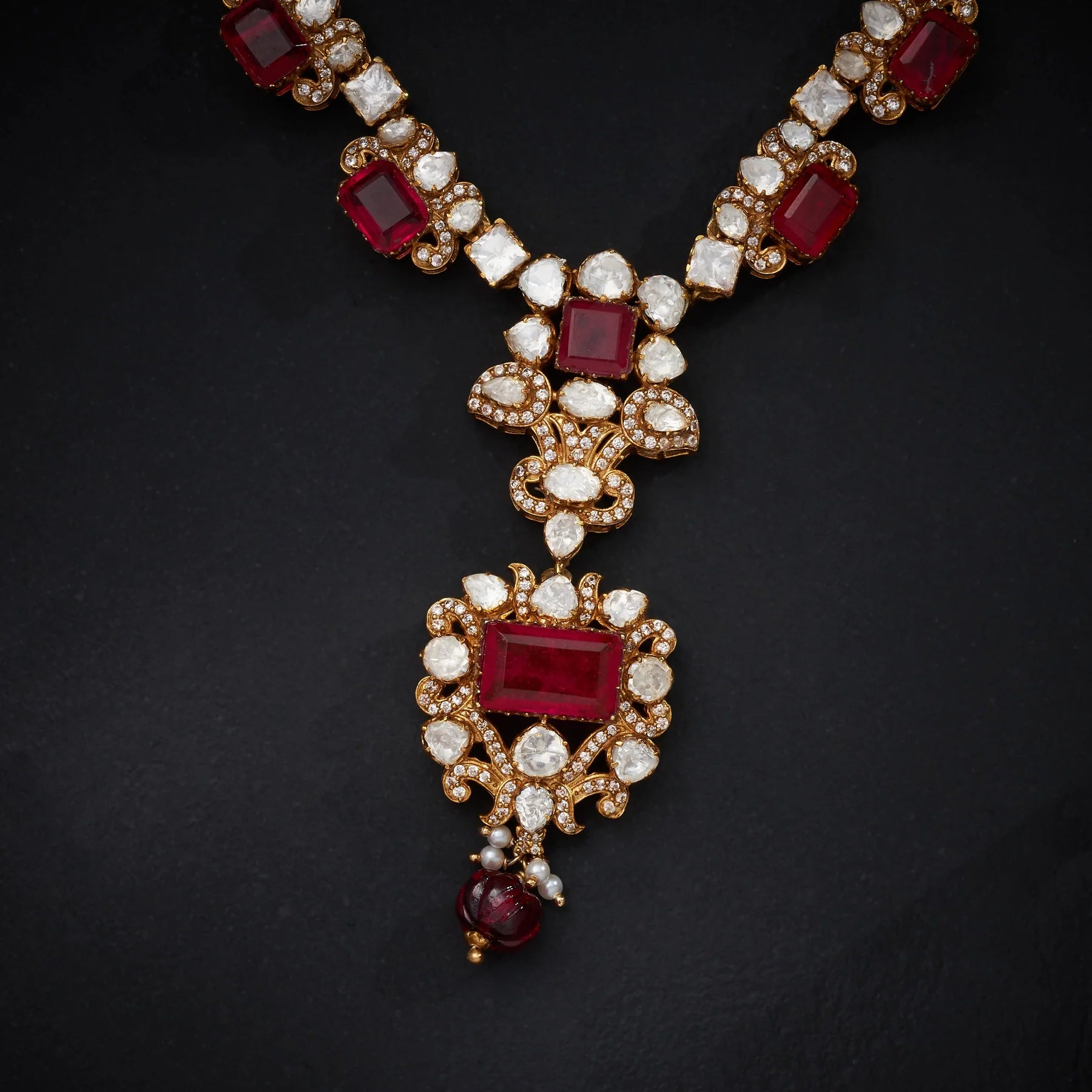 The Ruby Victorian Necklace Set combines timeless elegance with refined craftsmanship. This exquisite piece features a sophisticated blend of Moissanite, Cubic Zirconia, and Ruby stones arranged in both Rectangular and Oval settings, creating dimensional visual interest. Delicate Red bead hangings add a graceful finishing touch, enhancing the vintage-inspired aesthetic. Perfect for special occasions or as a statement accessory, this necklace set delivers versatility with its carefully curated gemstone composition and classic Victorian design elements.