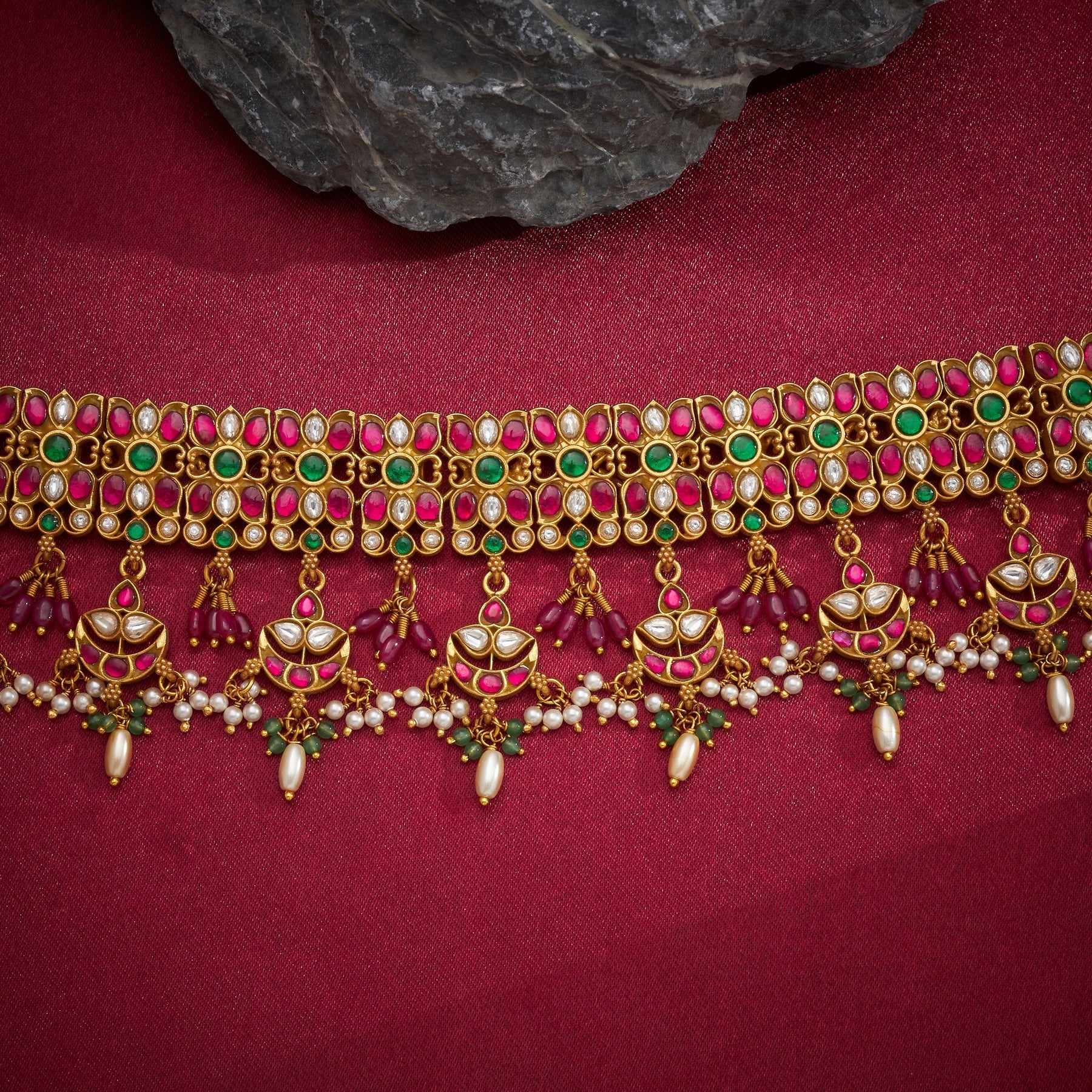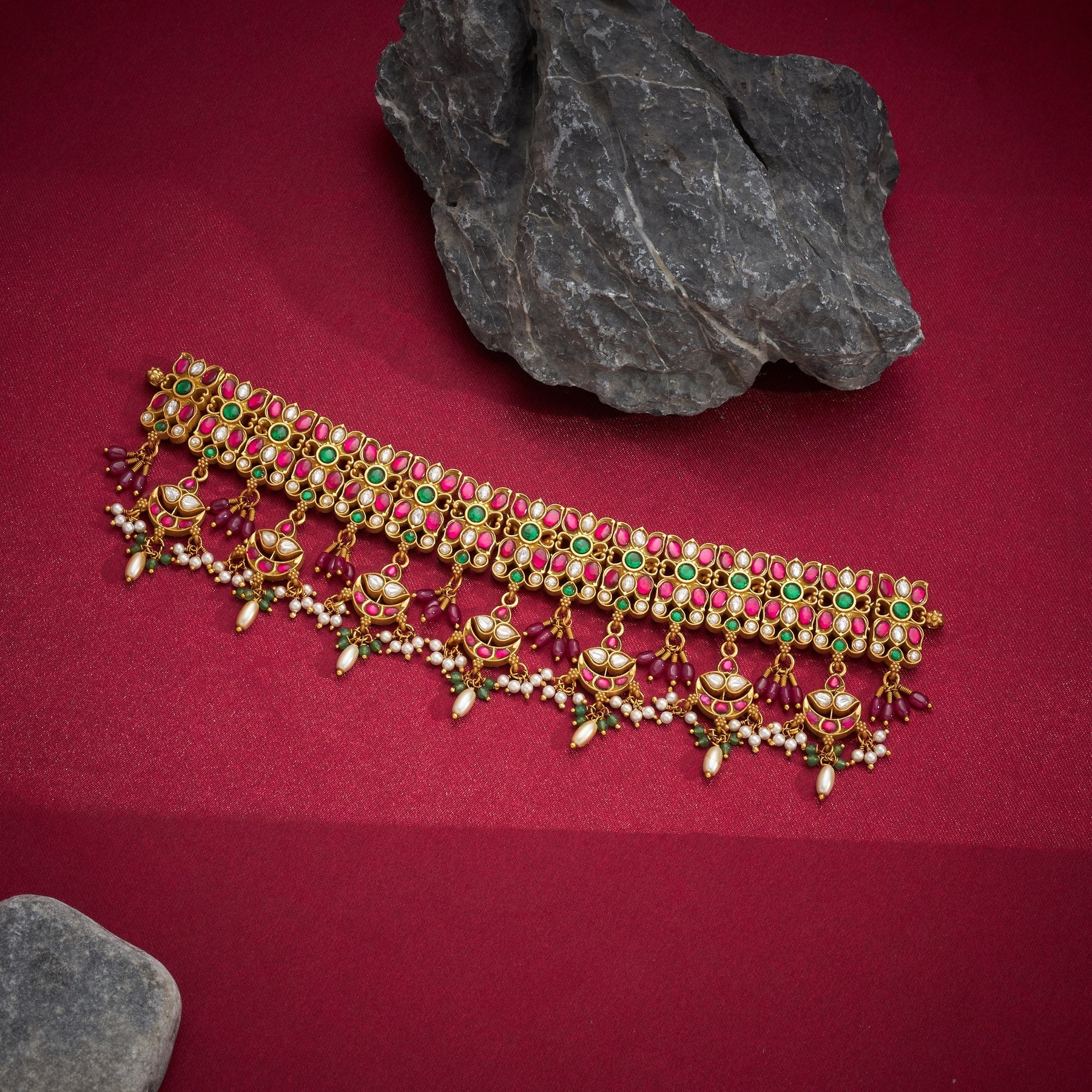 Sattvika Kundan Choker showcases intricate Floral artistry enhanced by traditional Kundan setting techniques. This piece features a harmonious blend of Ruby, Emerald, and Pearl drops that cascade gracefully, adding depth and movement to the design. Each gemstone is carefully selected and positioned to create a sophisticated interplay of colour and light. The Floral motifs are meticulously crafted, reflecting heritage craftsmanship while maintaining contemporary elegance. Perfect for special occasions, this choker combines timeless artistry with refined gemstone work, making it an investment piece for discerning collectors.