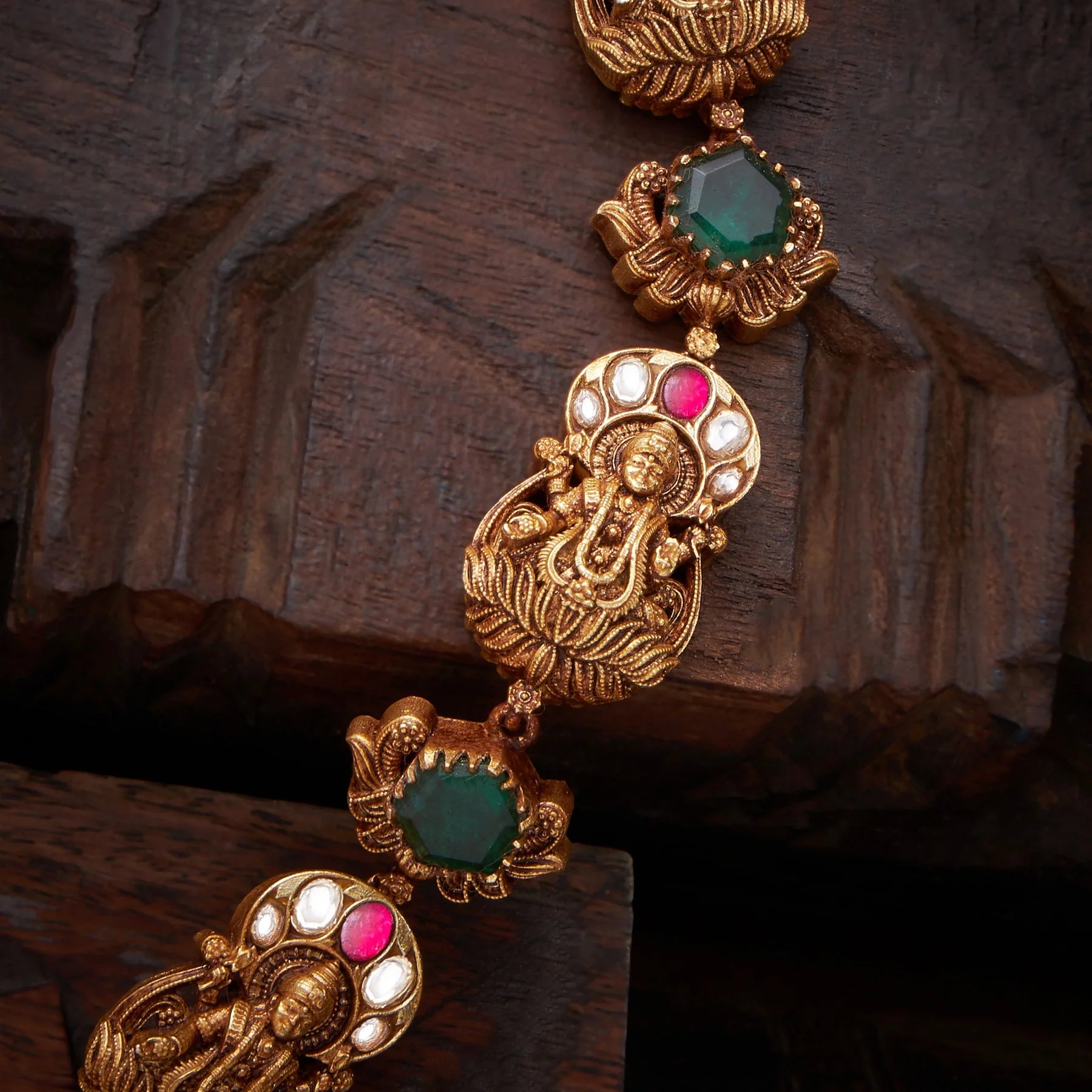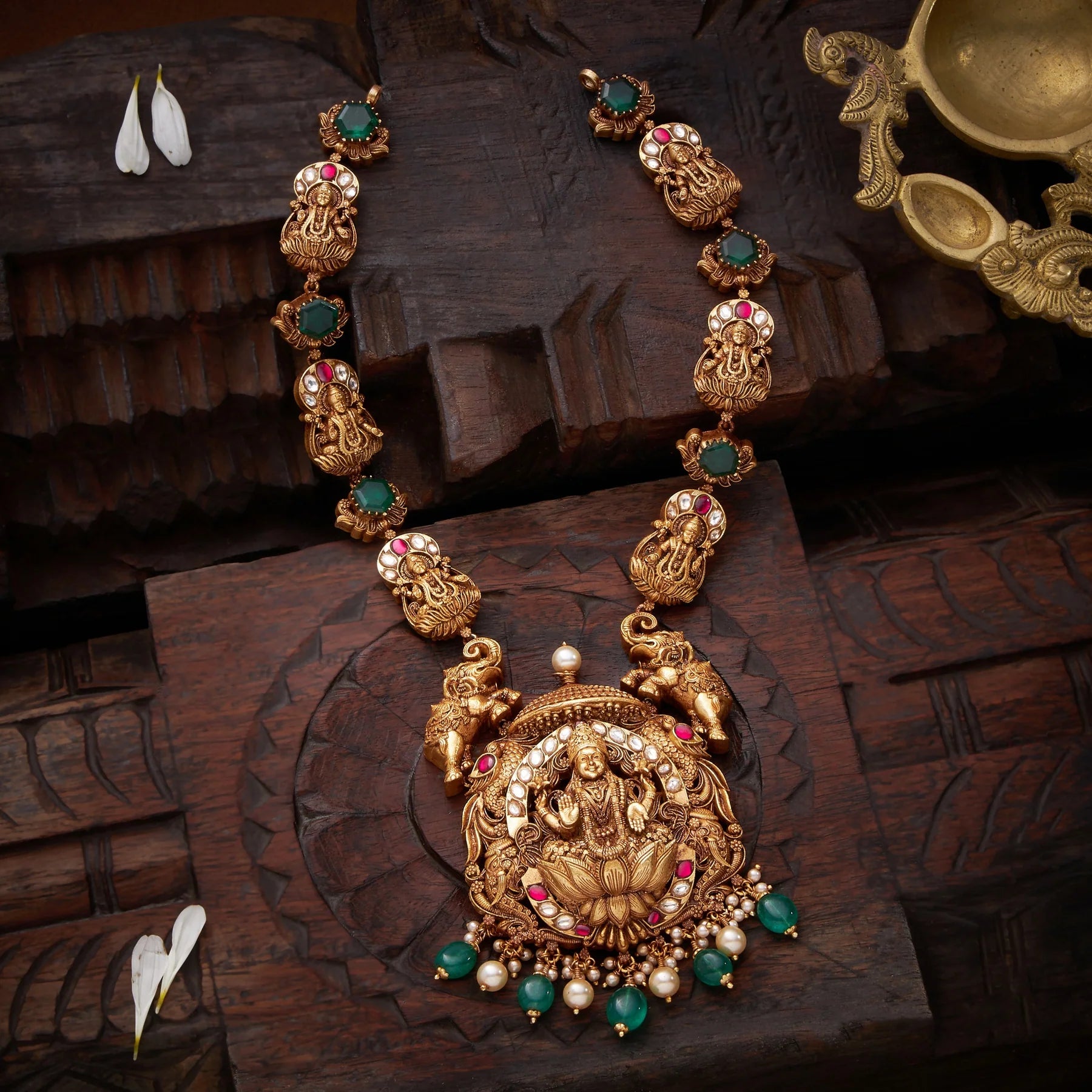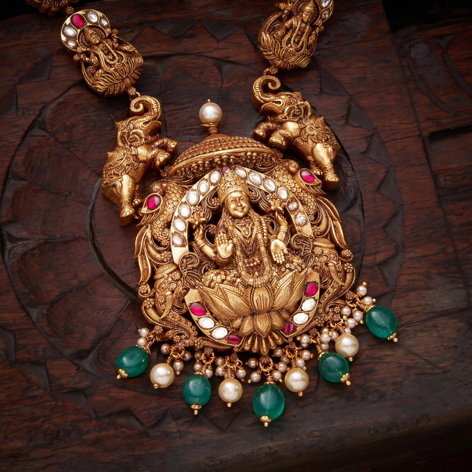 The Swarnika Temple Necklace combines traditional craftsmanship with timeless elegance. Adorned with sacred Lakshmi, Elephant, and Peacock motifs, this piece celebrates auspicious symbolism through intricate design. The Kundan setting showcases meticulous gemstone placement, while Emerald and Pearl drops add refined sophistication and luminous contrast. Perfect for festive occasions, temple visits, or those seeking meaningful jewellery that honours cultural heritage with expert artistry.