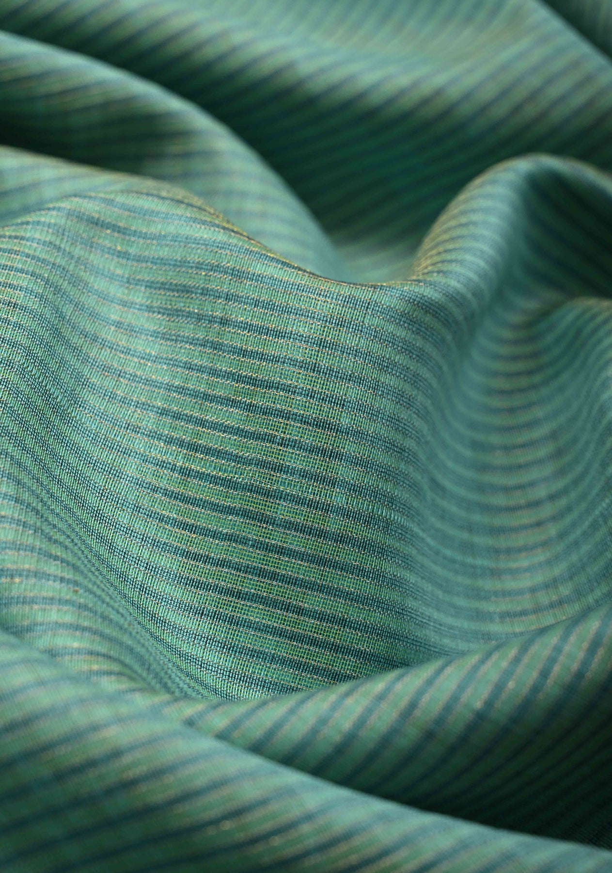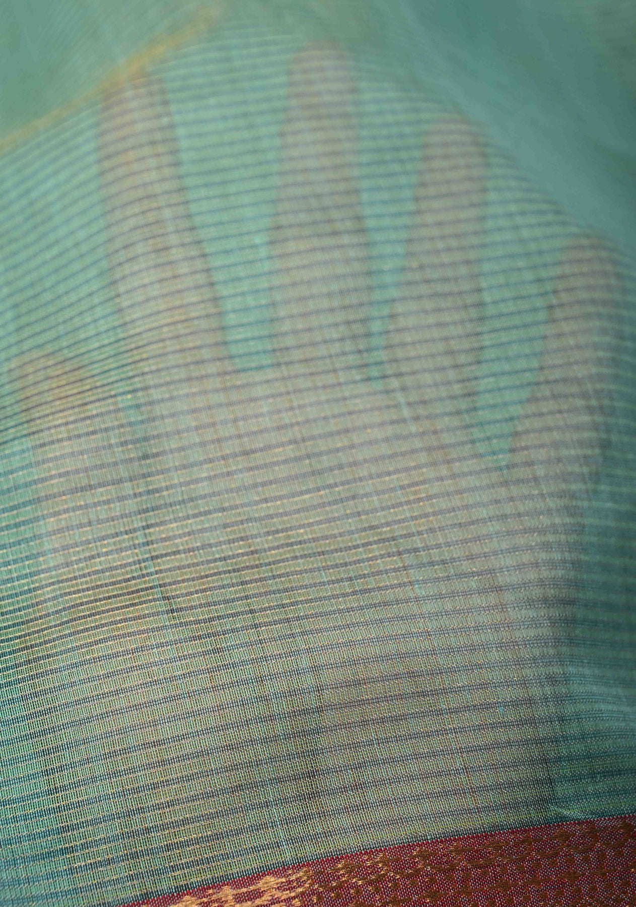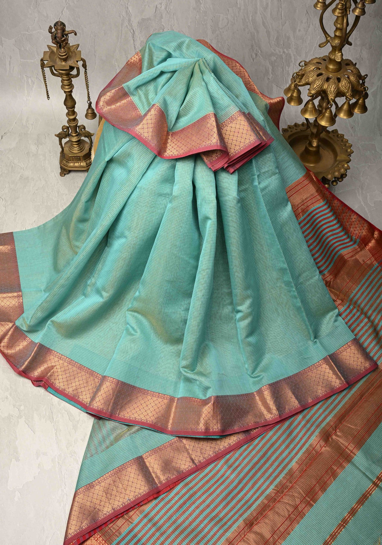 The soothing aqua hue is complemented by contrast zari borders, woven in traditional patterns that add a refined edge and subtle shimmer to the look. The saree’s minimalist design, balanced with rich craftsmanship, makes it an ideal choice for both casual elegance and festive occasions.