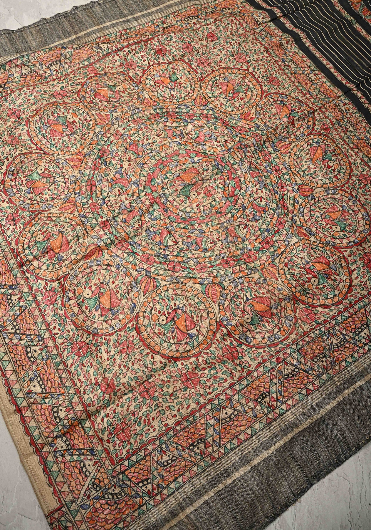 Beige Desi Tussar Madhubani Hand-Painted Saree  | SILK MARK CERTIFIED