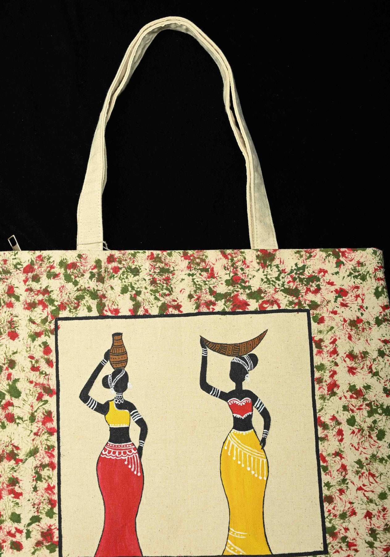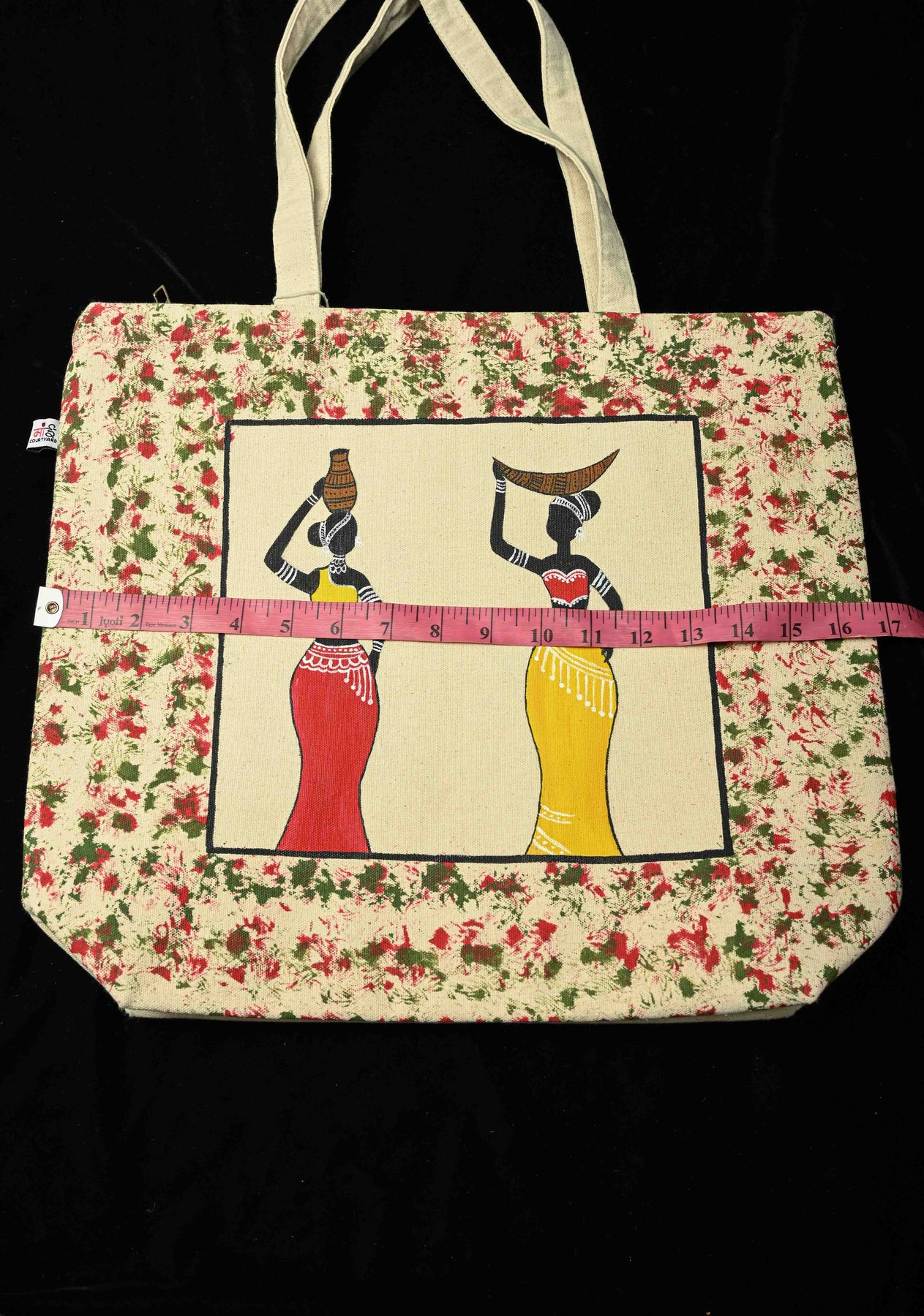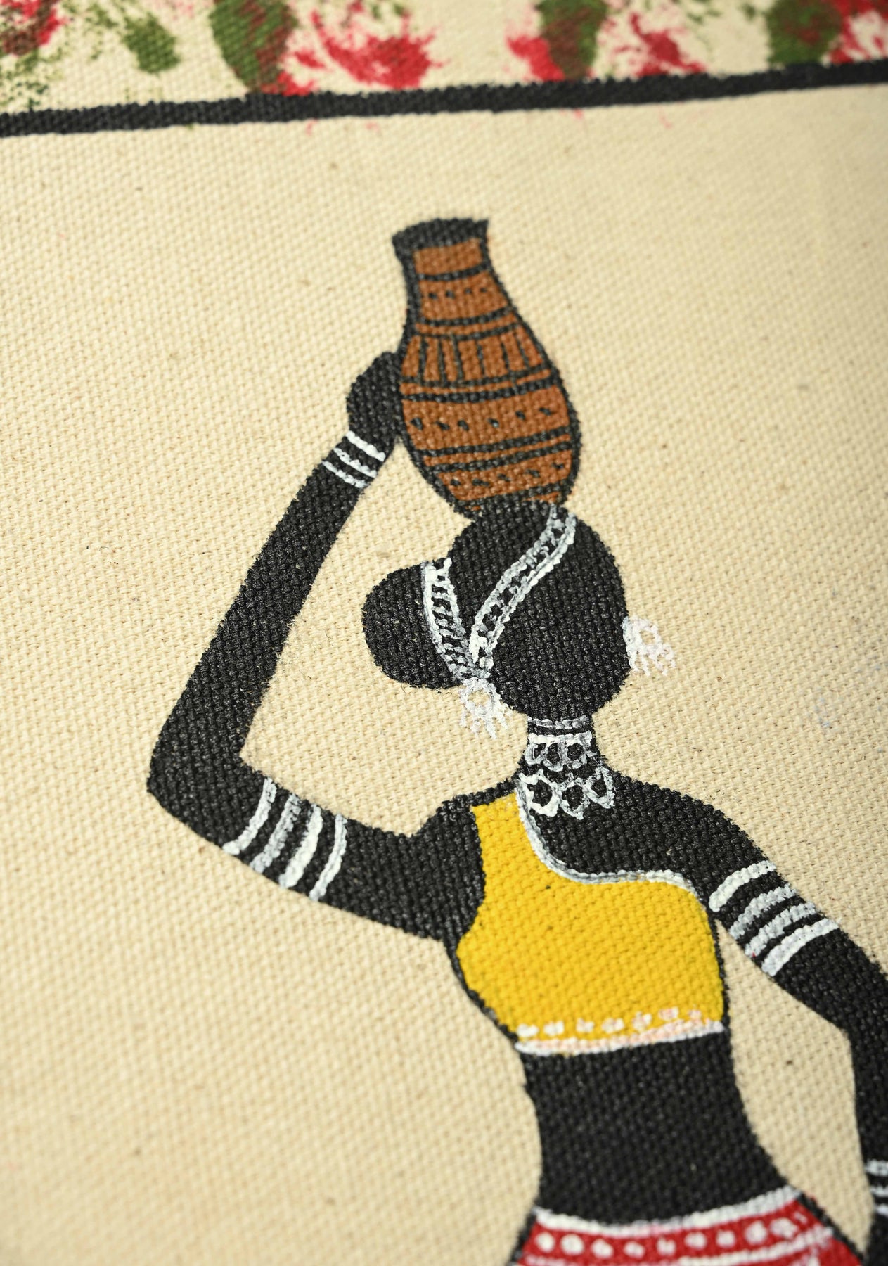 Beige Jute Canvas Bag with Folk Hand Painted Tote bag