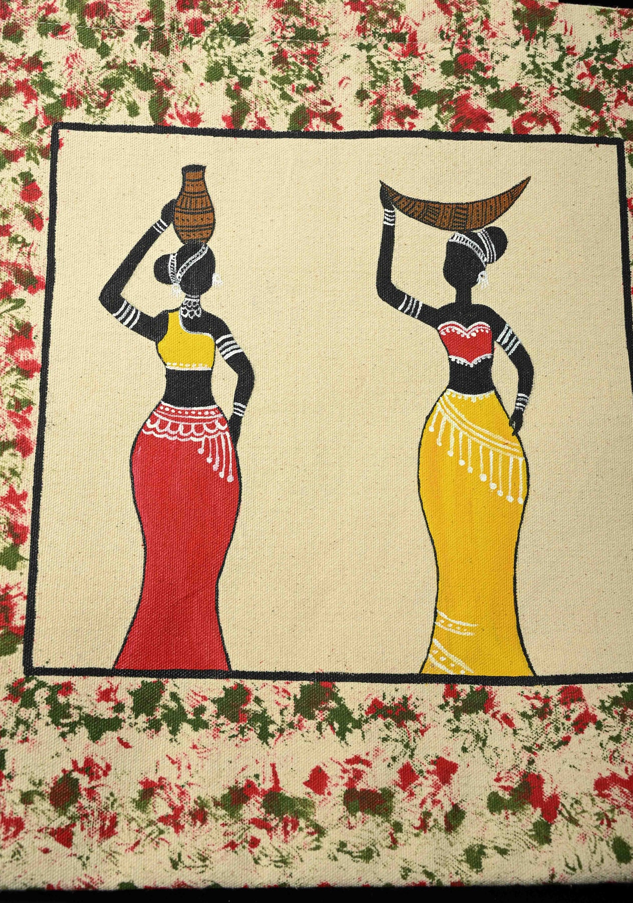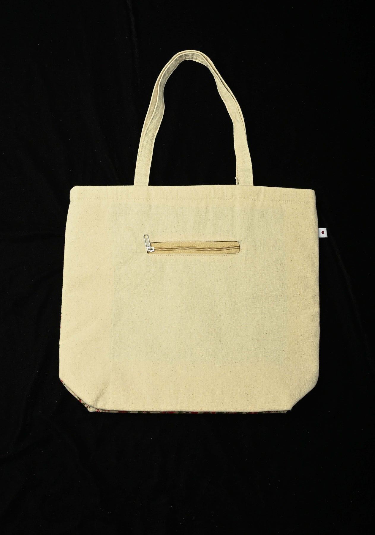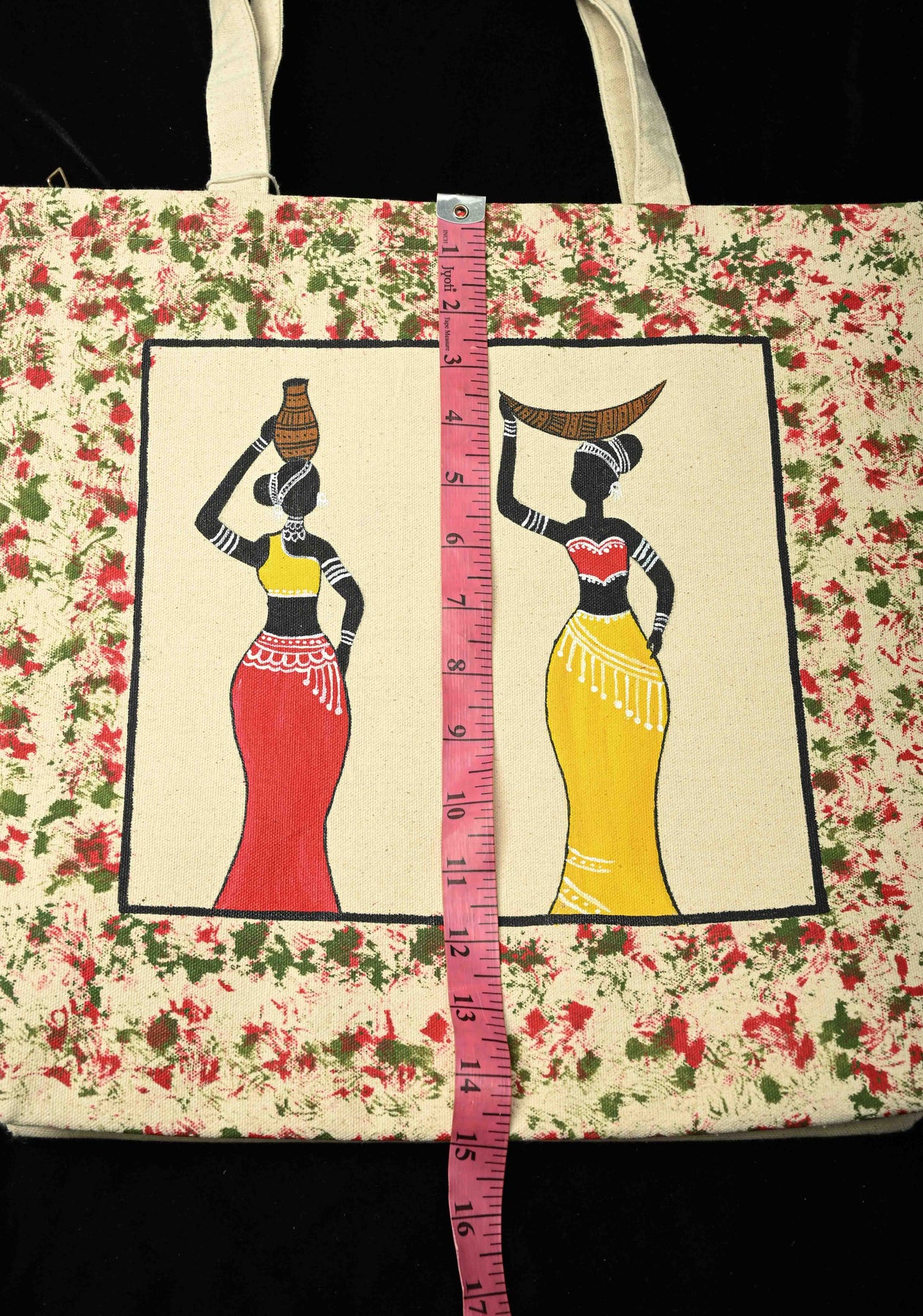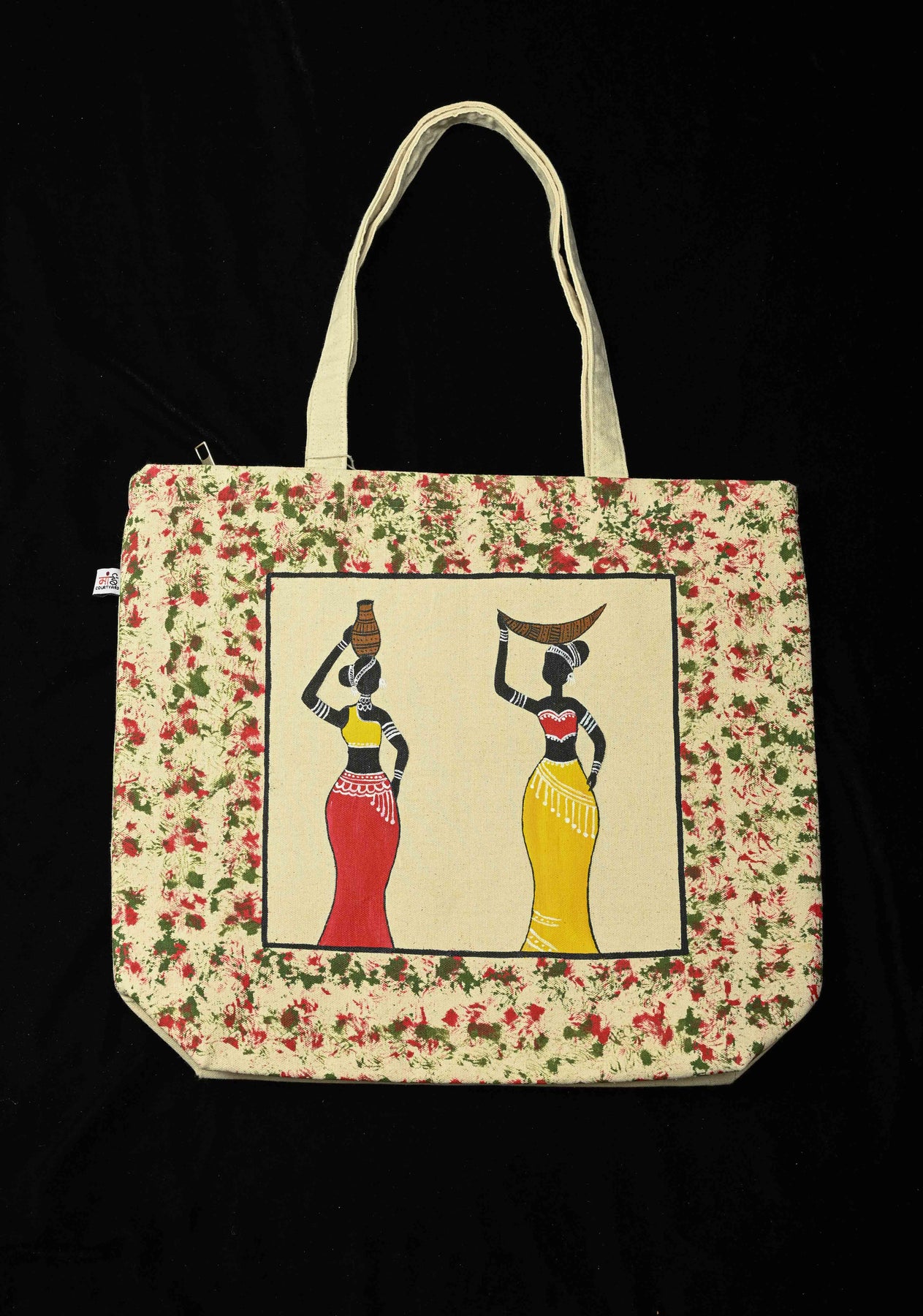 Beige Jute Canvas Bag with Folk Hand Painted Tote bag