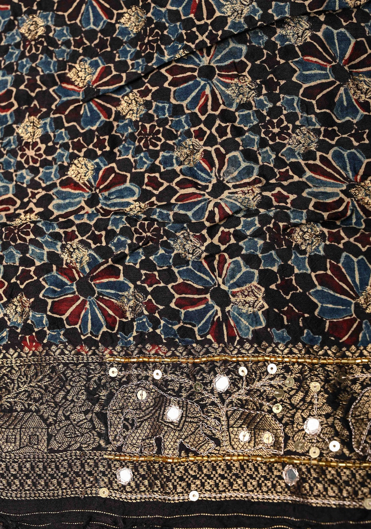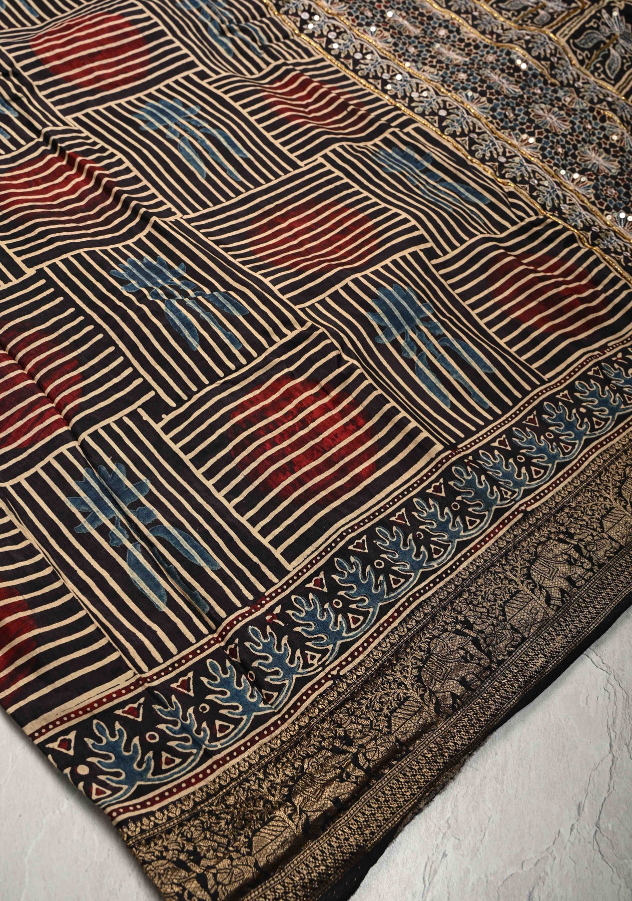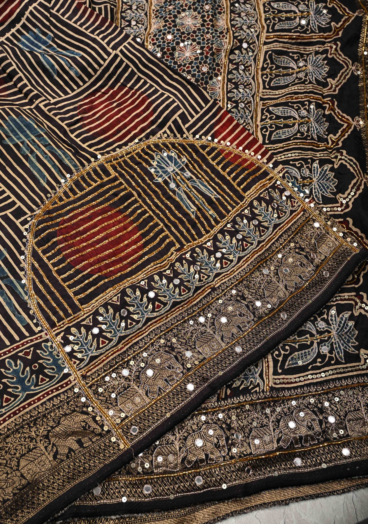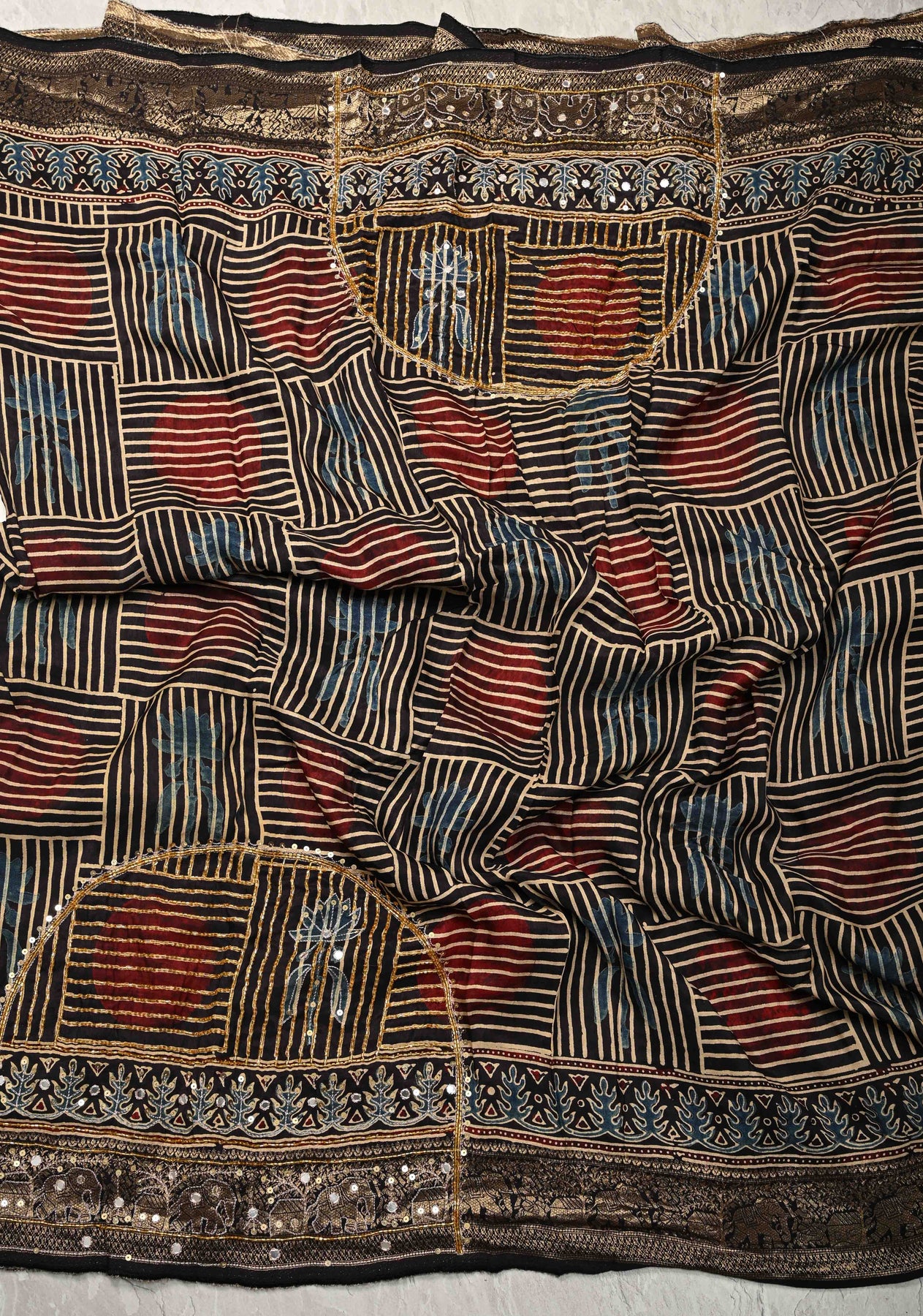 Black Ajrakh Hand Block Print on Dola Silk Saree with Cutdana-Sequins-Mirror Work and Fancy Zari Border