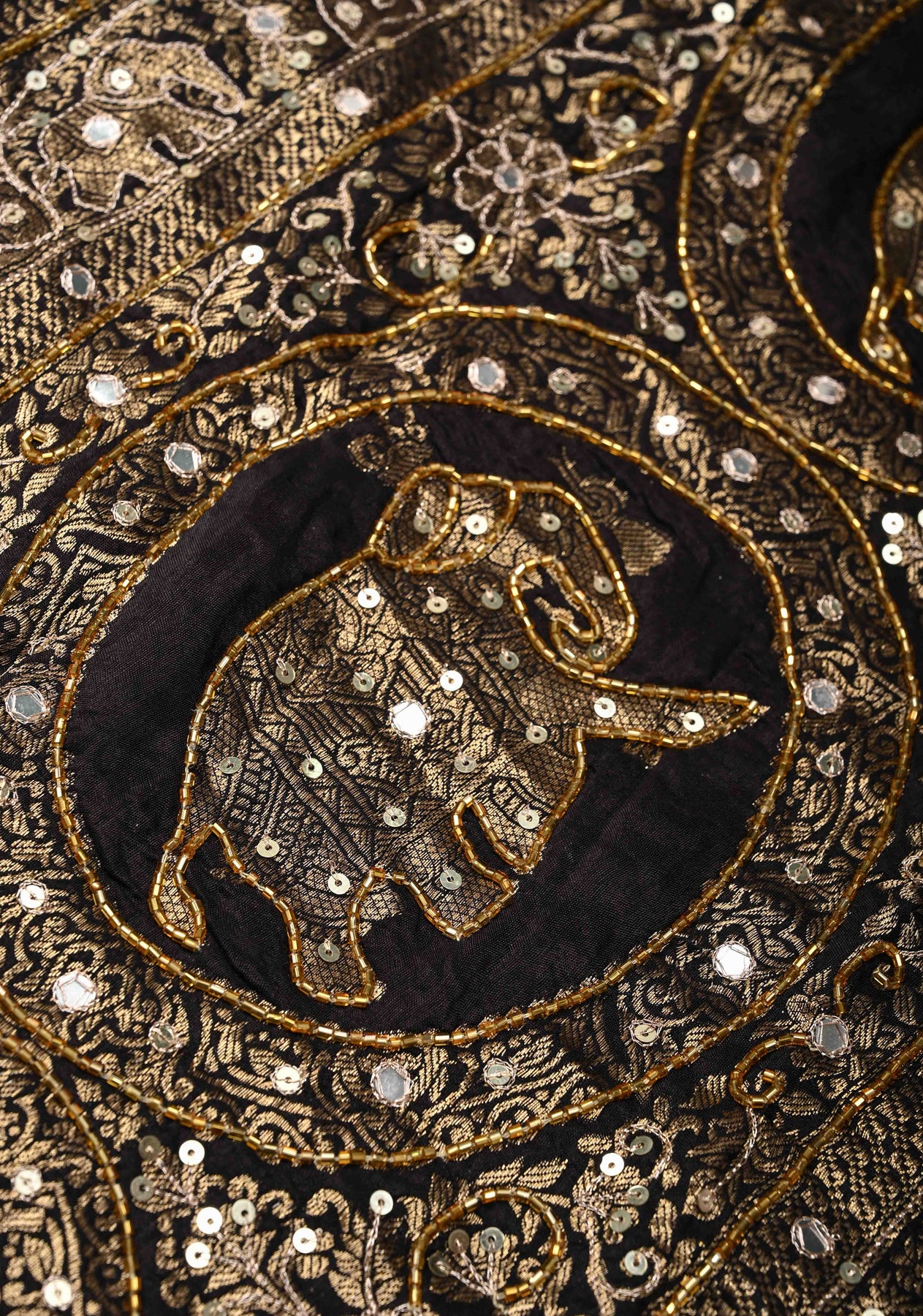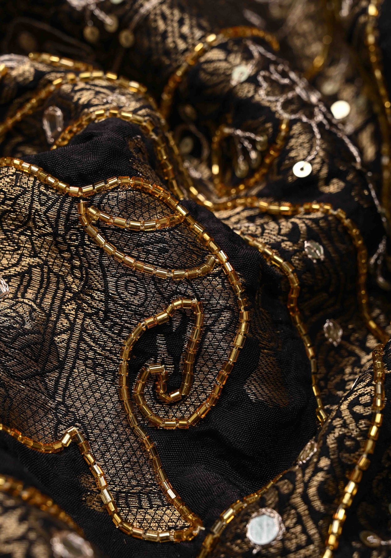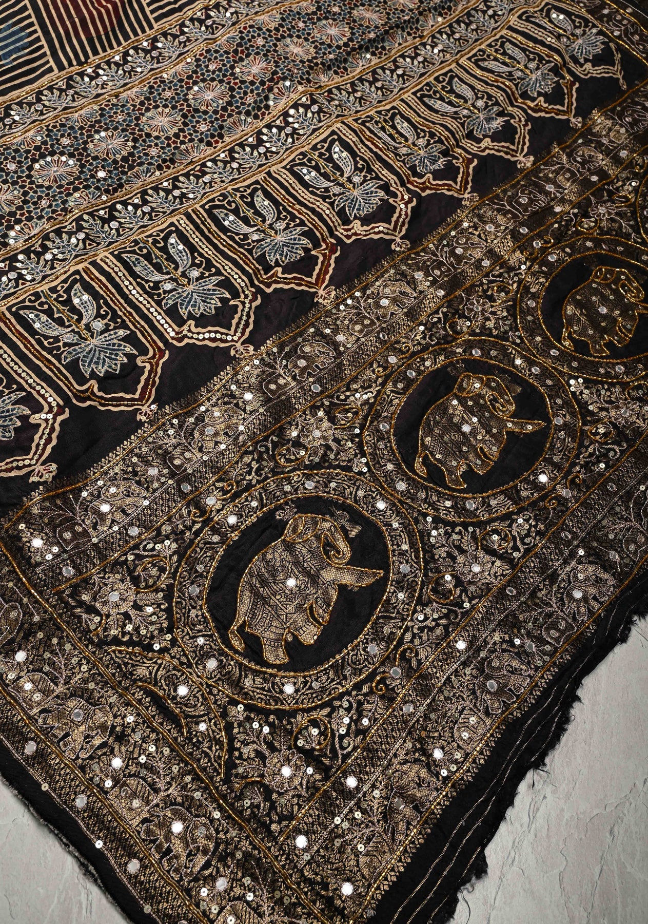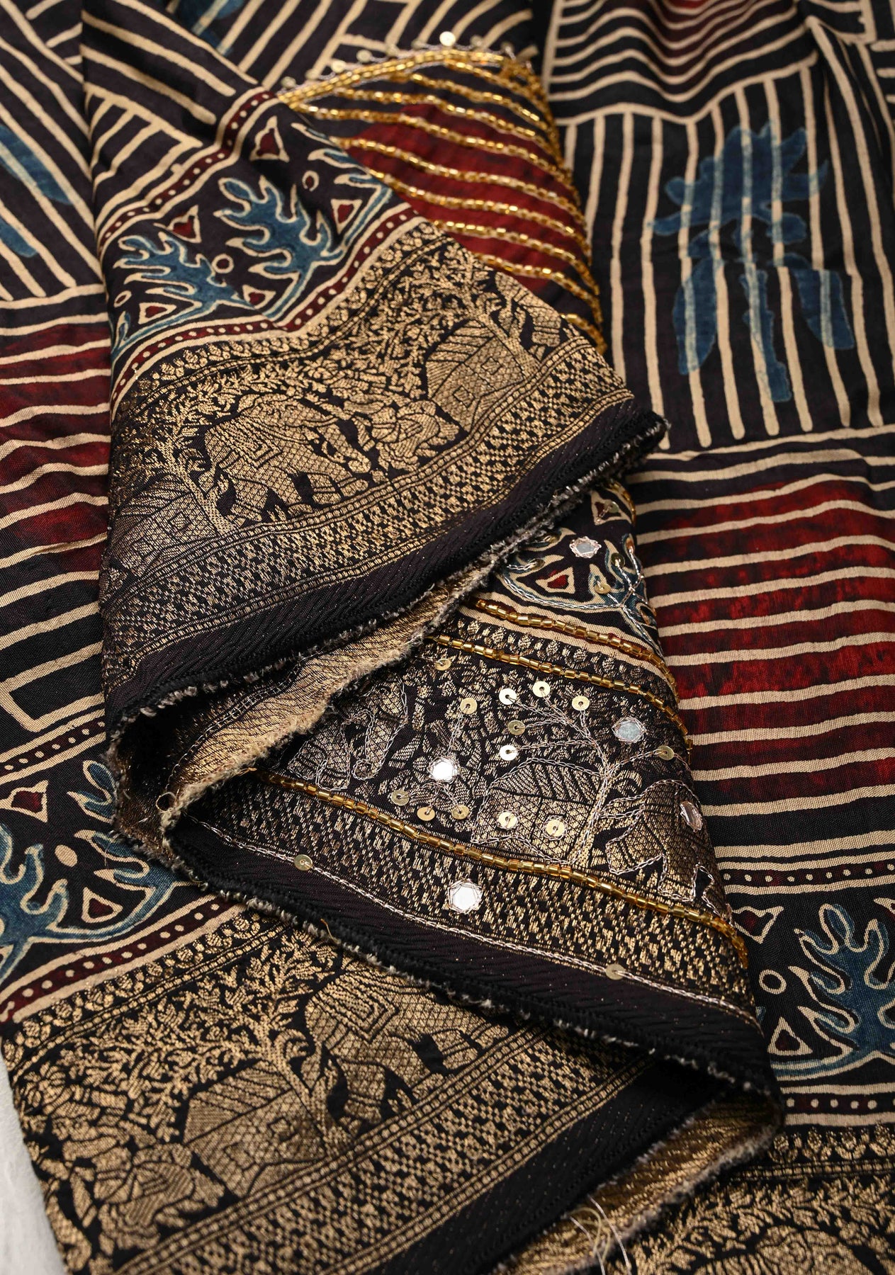 Black Ajrakh Hand Block Print on Dola Silk Saree with Cutdana-Sequins-Mirror Work and Fancy Zari Border