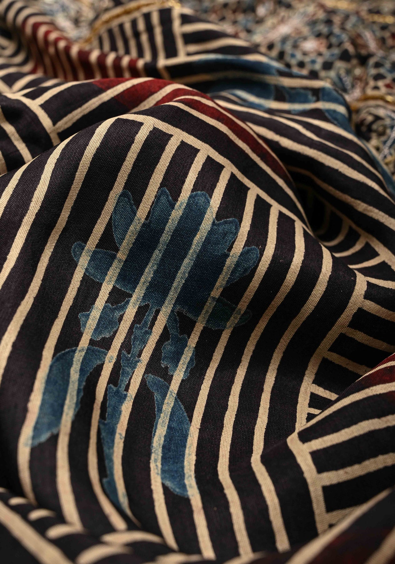 The timeless Ajrakh hand block print lends an artisanal appeal, showcasing intricate motifs in earthy tones across the black base. What sets this saree apart is its exquisite detailing — Cutdana, sequins, and mirror work add a refined sparkle, elevating the traditional print into festive . The look is completed with a fancy zari border, adding a touch of grandeur and contrast.