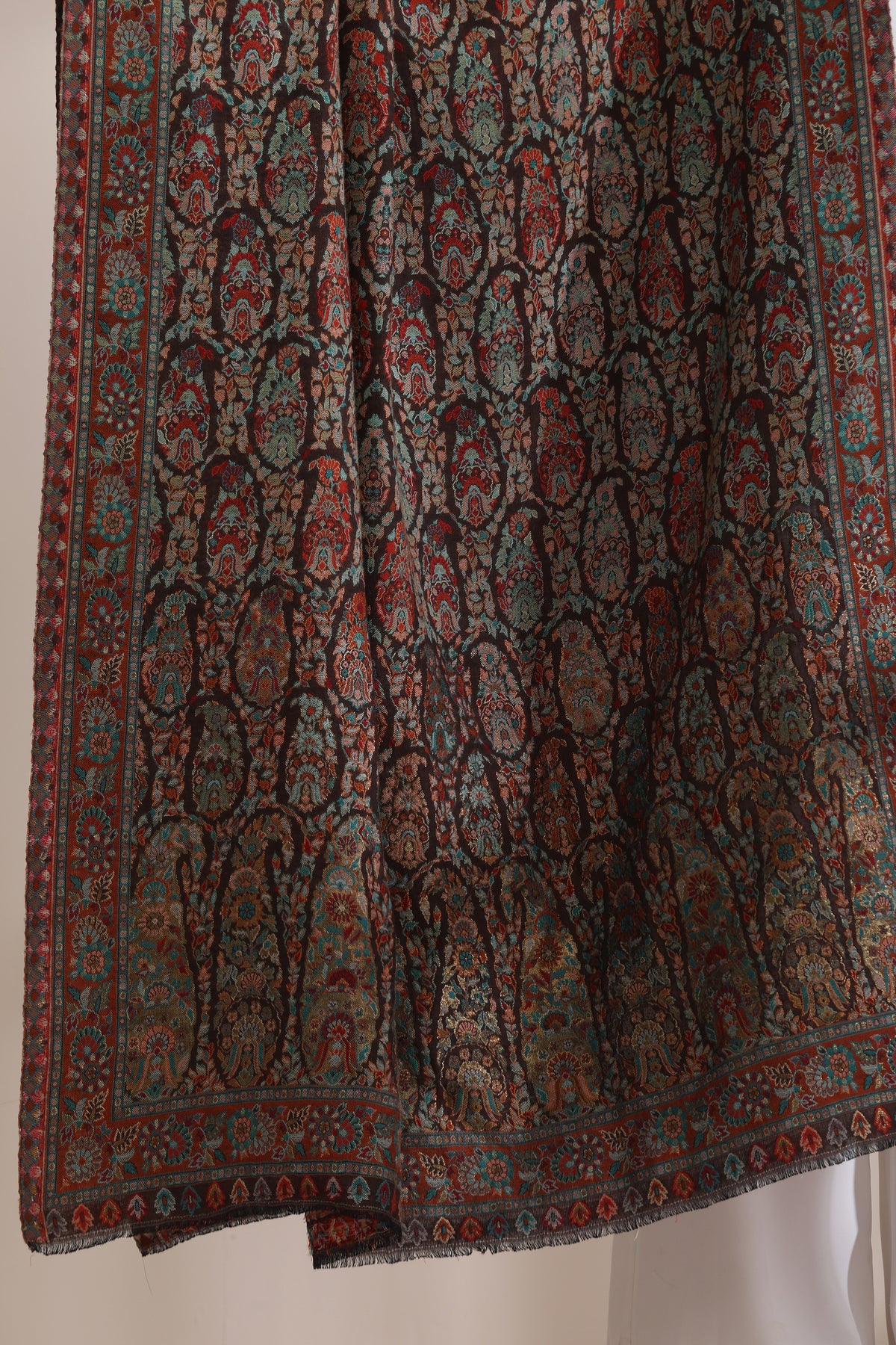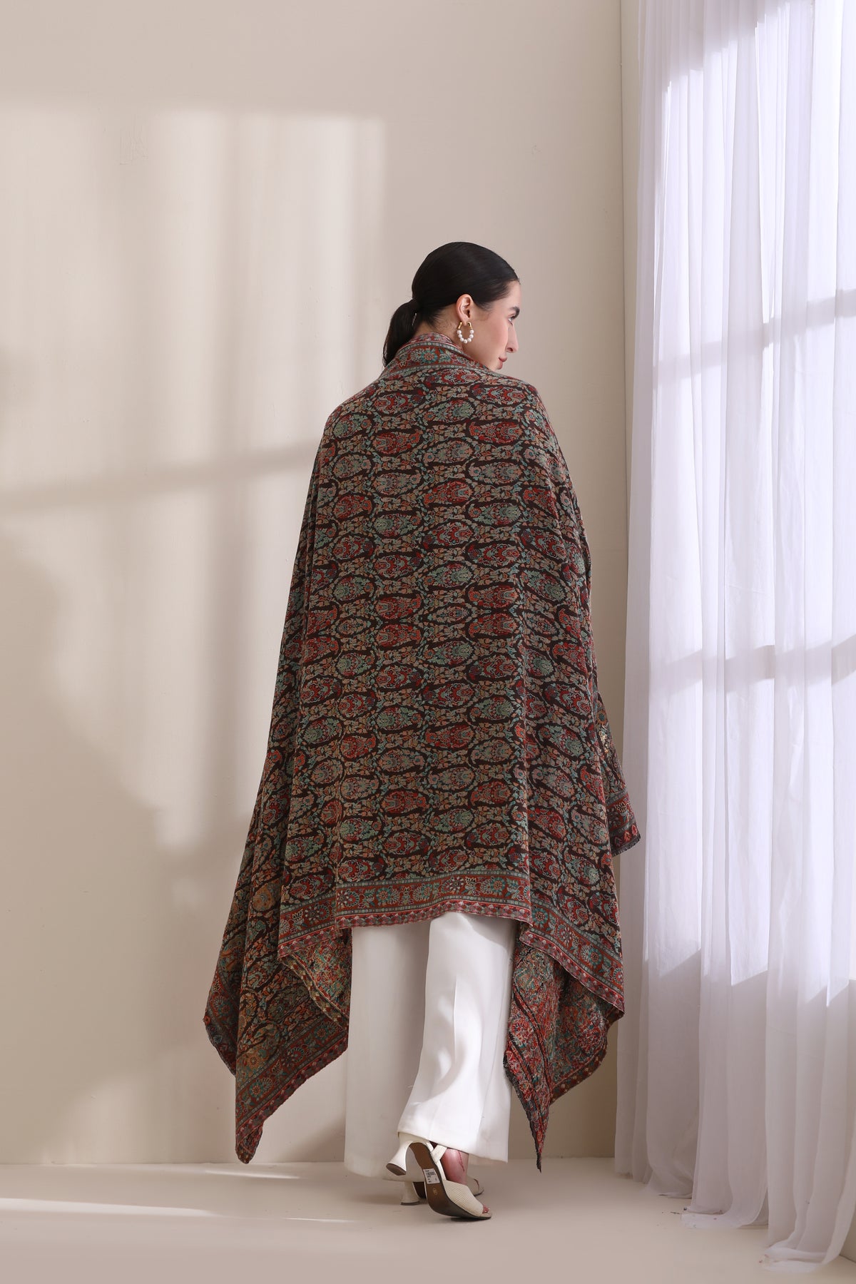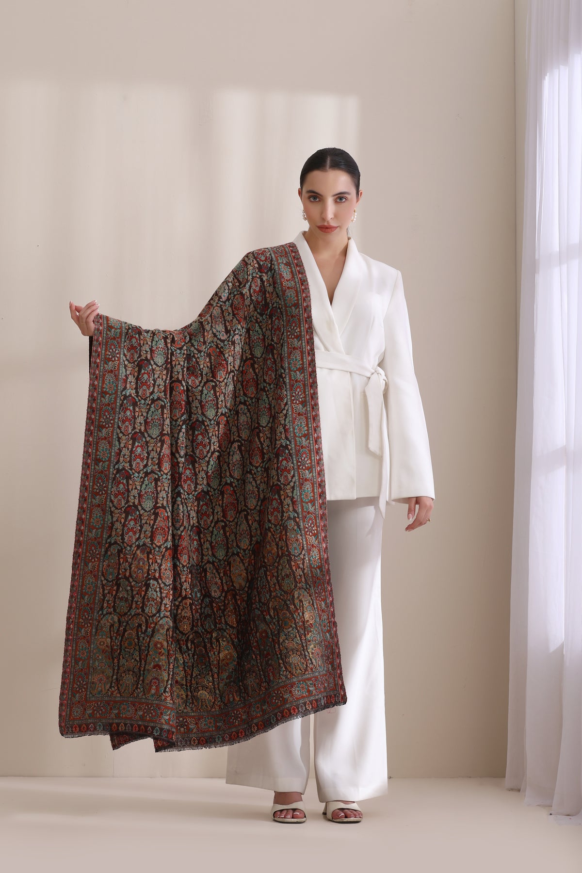 This elegant shawl features an allover Jamawar design highlighted with zari work, giving it a subtle shimmer. The multicolored motifs and traditional border offer both heritage charm and modern appeal, making it perfect for festive occasions and evening wear which make this ideal for gifting