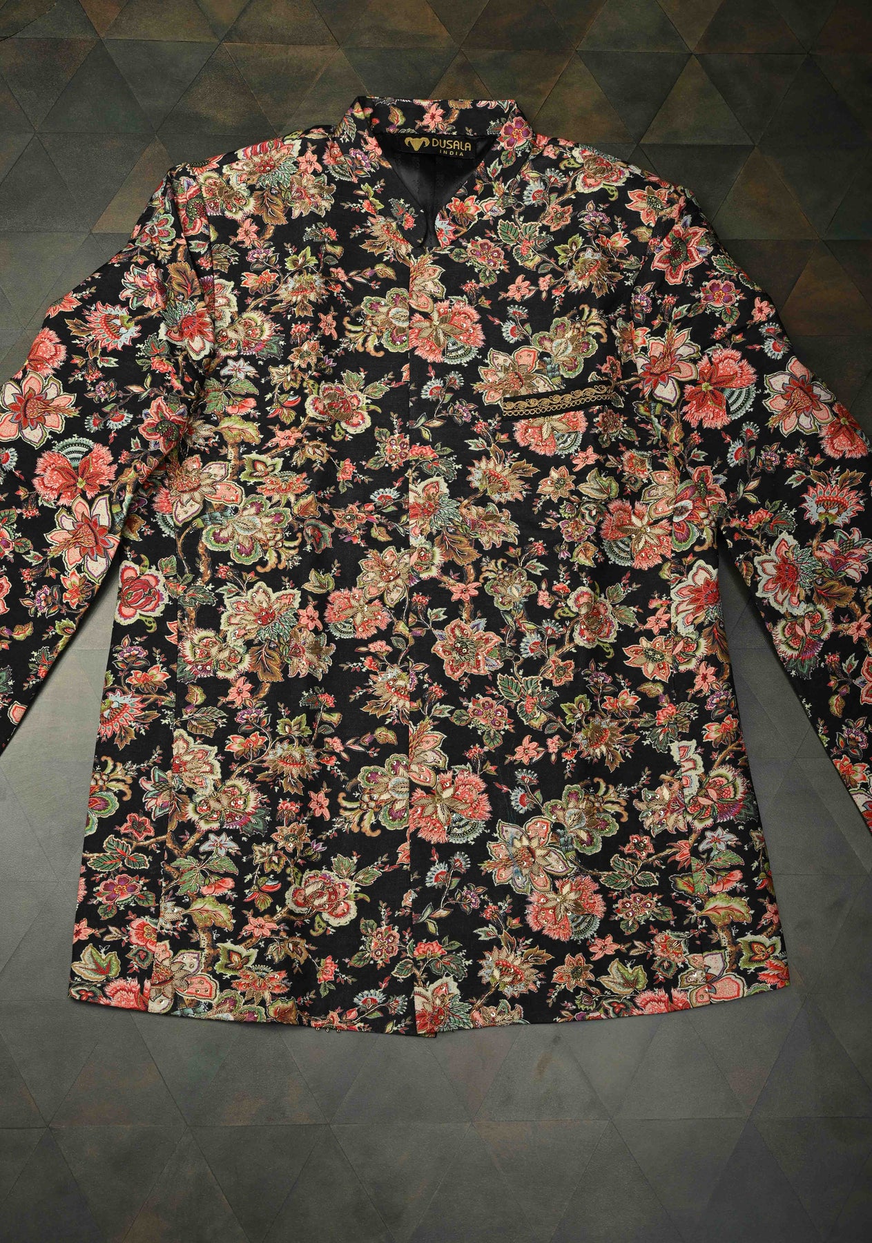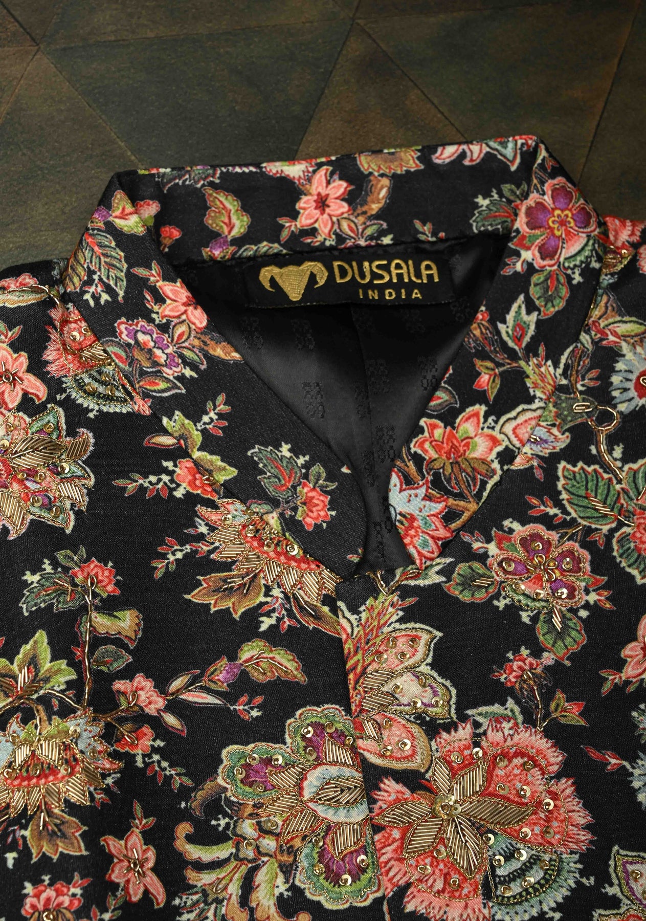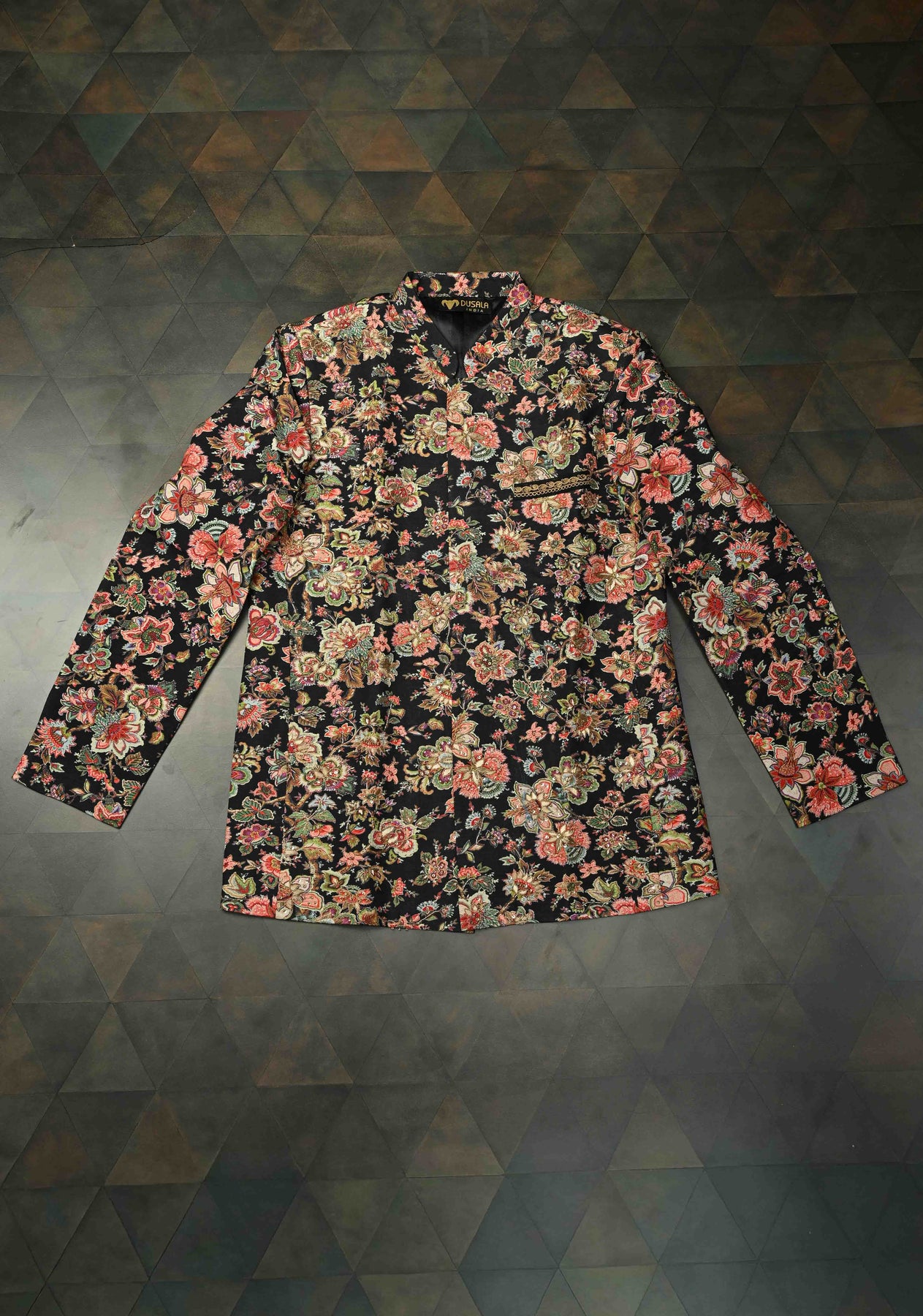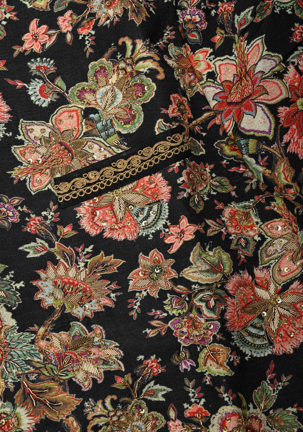 The Black Floral Digital Print Bandhgala Silk Full Jacket for Men is a luxurious fusion of contemporary style and traditional craftsmanship. Made from silk, the jacket features a rich black base adorned with floral digital prints, creating a bold yet refined visual appeal. Intricate Zardozi and sequins embroidery enhances the design with regal detailing, adding depth, texture, and a subtle sparkle that elevates the jacket’s elegance. Tailored in a classic bandhgala silhouette, this full jacket offers a structured, sophisticated fit ideal for weddings, festive celebrations, receptions, and formal gatherings. Its impeccable craftsmanship and striking aesthetics make it a standout statement piece for any grand occasion.