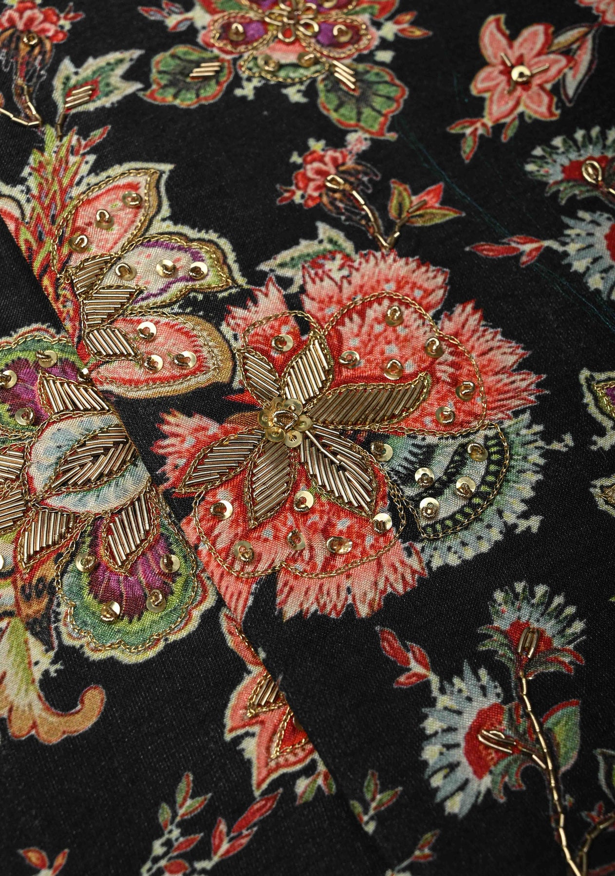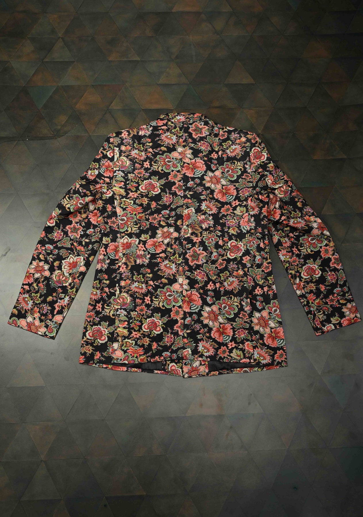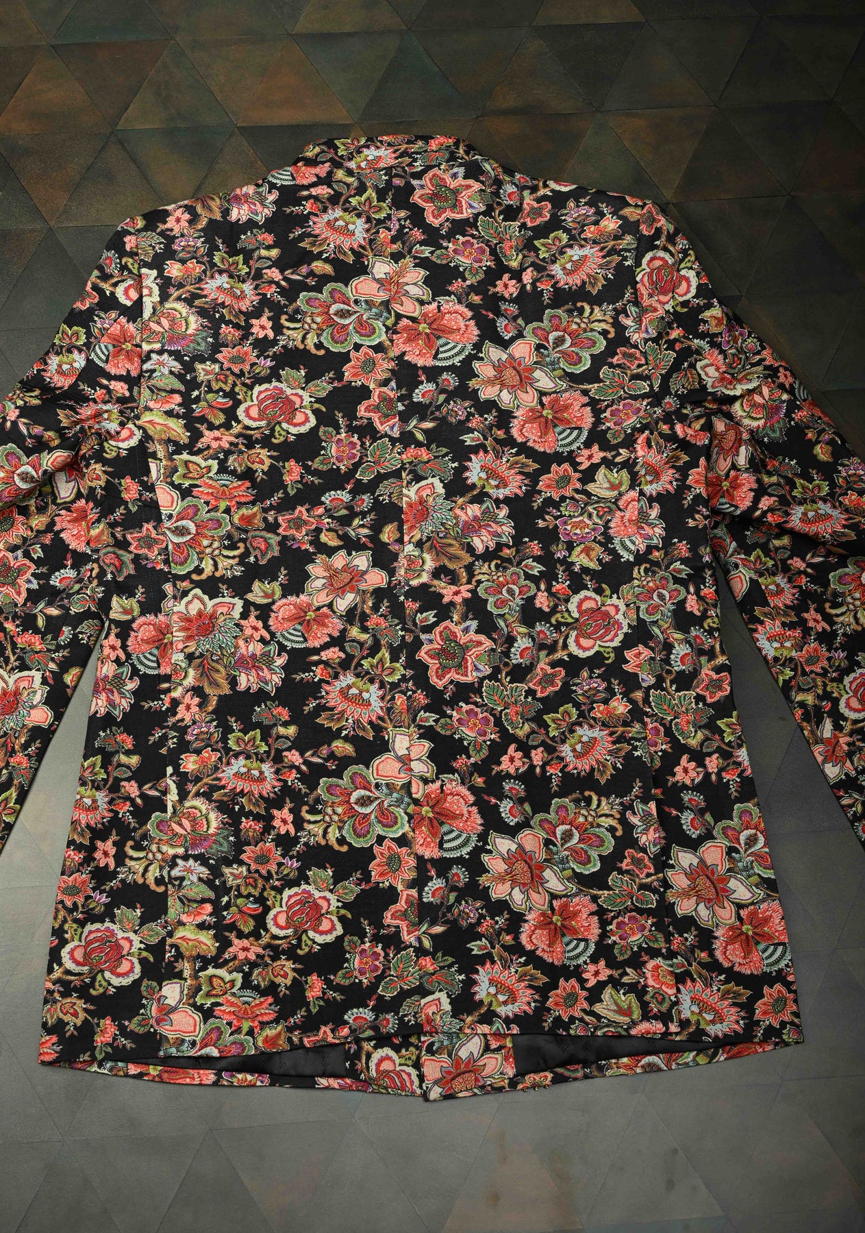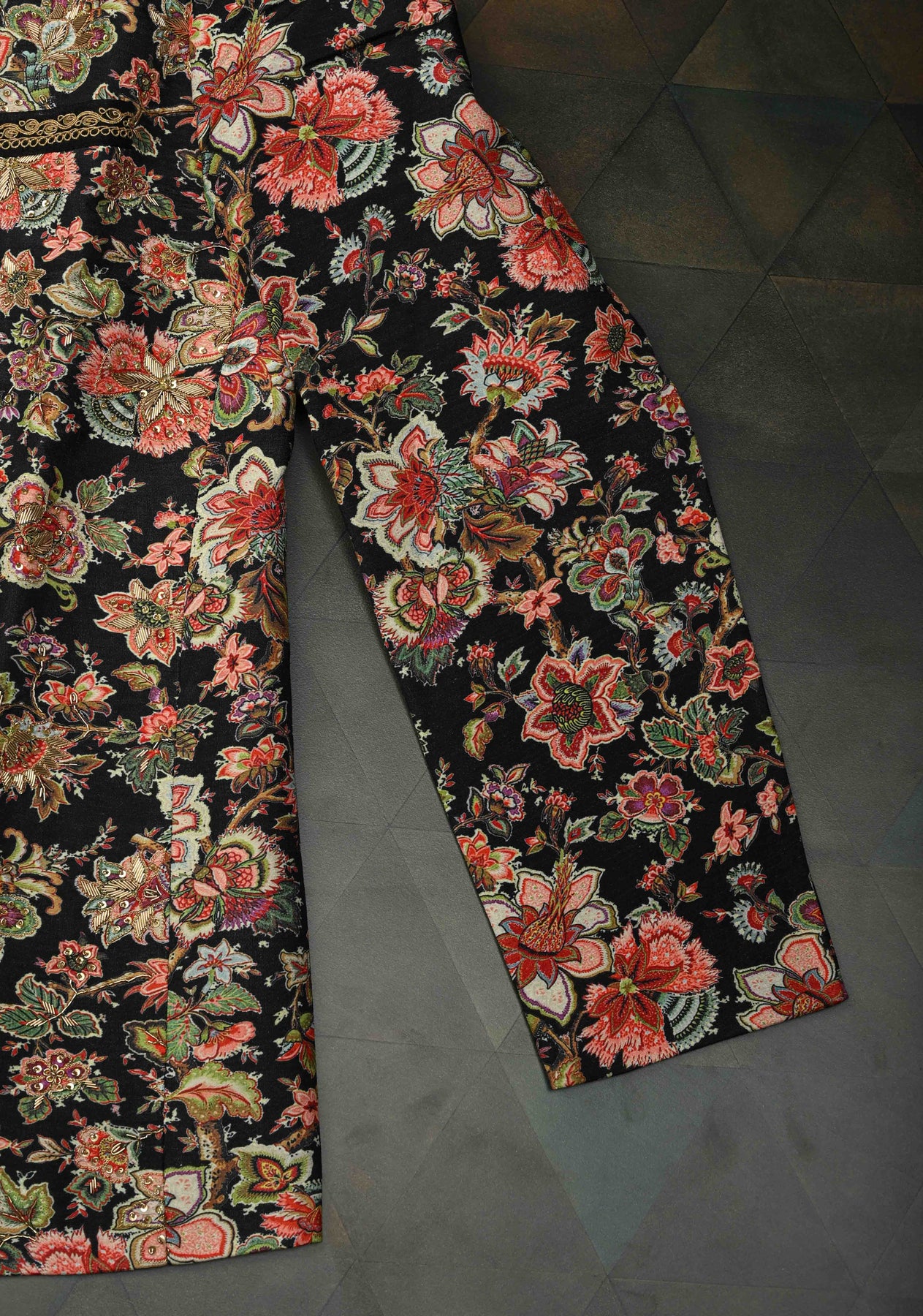 The Black Floral Digital Print Bandhgala Silk Full Jacket for Men is a luxurious fusion of contemporary style and traditional craftsmanship. Made from silk, the jacket features a rich black base adorned with floral digital prints, creating a bold yet refined visual appeal. Intricate Zardozi and sequins embroidery enhances the design with regal detailing, adding depth, texture, and a subtle sparkle that elevates the jacket’s elegance. Tailored in a classic bandhgala silhouette, this full jacket offers a structured, sophisticated fit ideal for weddings, festive celebrations, receptions, and formal gatherings. Its impeccable craftsmanship and striking aesthetics make it a standout statement piece for any grand occasion.