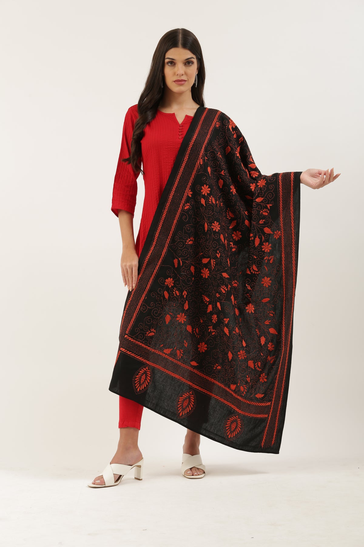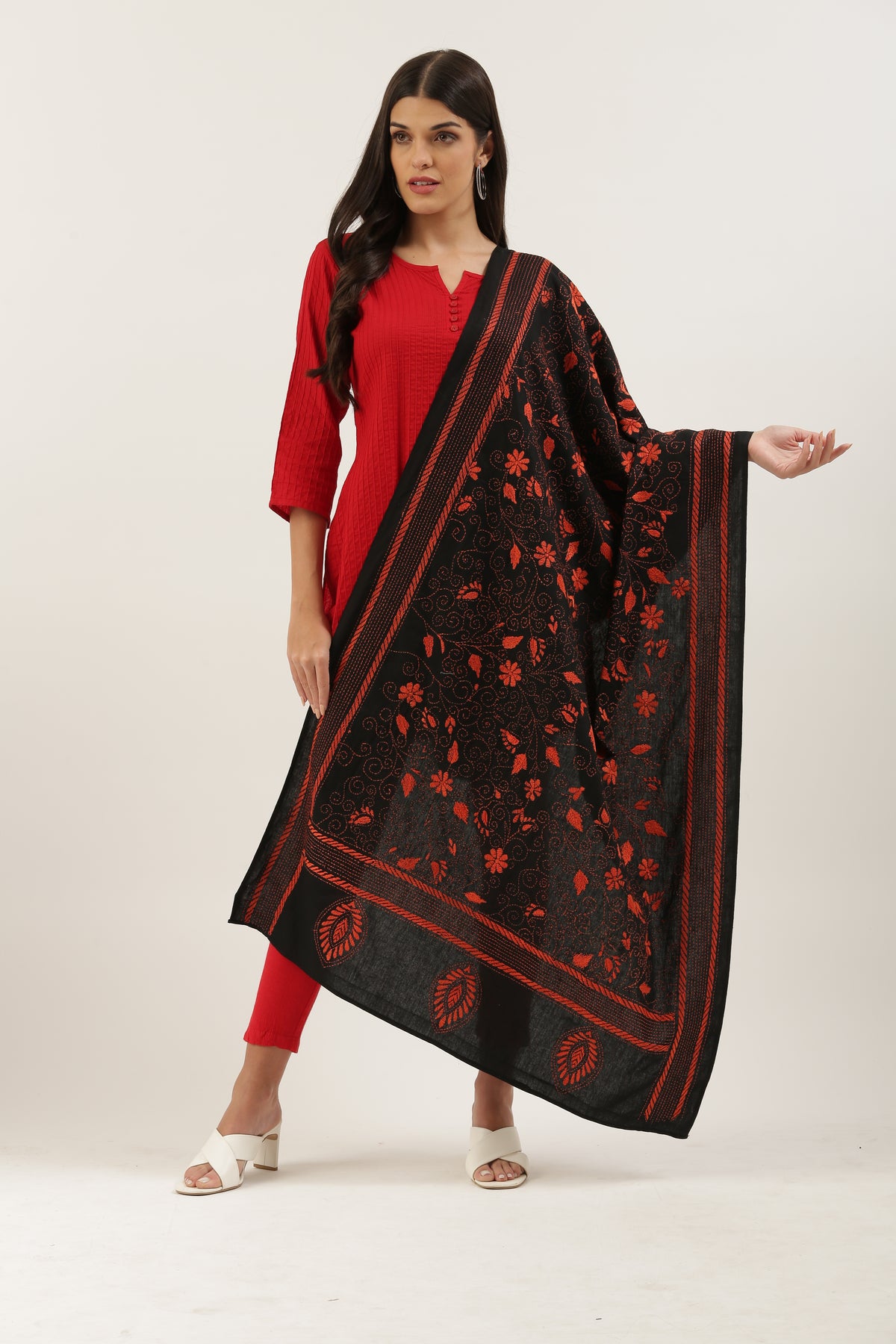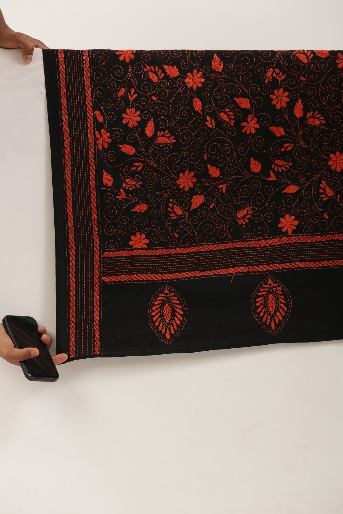 A Floral Black Kantha Cotton Dupatta beautifully blends traditional craftsmanship with delicate, nature-inspired elegance. Made from soft and breathable cotton, this dupatta features intricate Kantha embroidery, a heritage stitching technique from Bengal known for its fine, hand-sewn detailing. The floral motifs are crafted with precision, bringing a charming mix of color, texture, and artistry to the fabric. Lightweight and easy to drape, it adds a graceful touch to both casual and festive outfits. Whether paired with a simple kurta or a dressy ensemble, this dupatta elevates your look with its timeless appeal and handcrafted beauty.