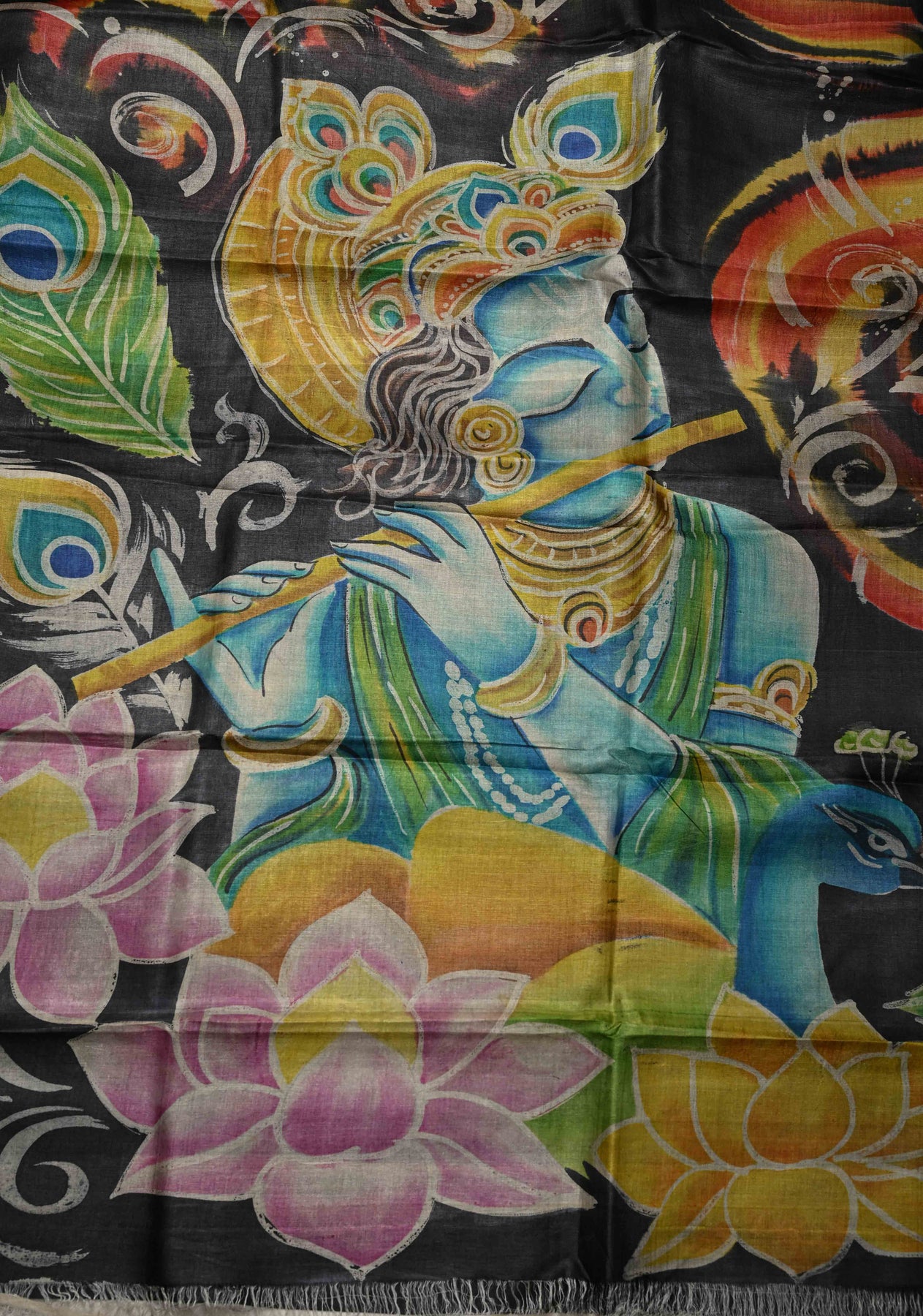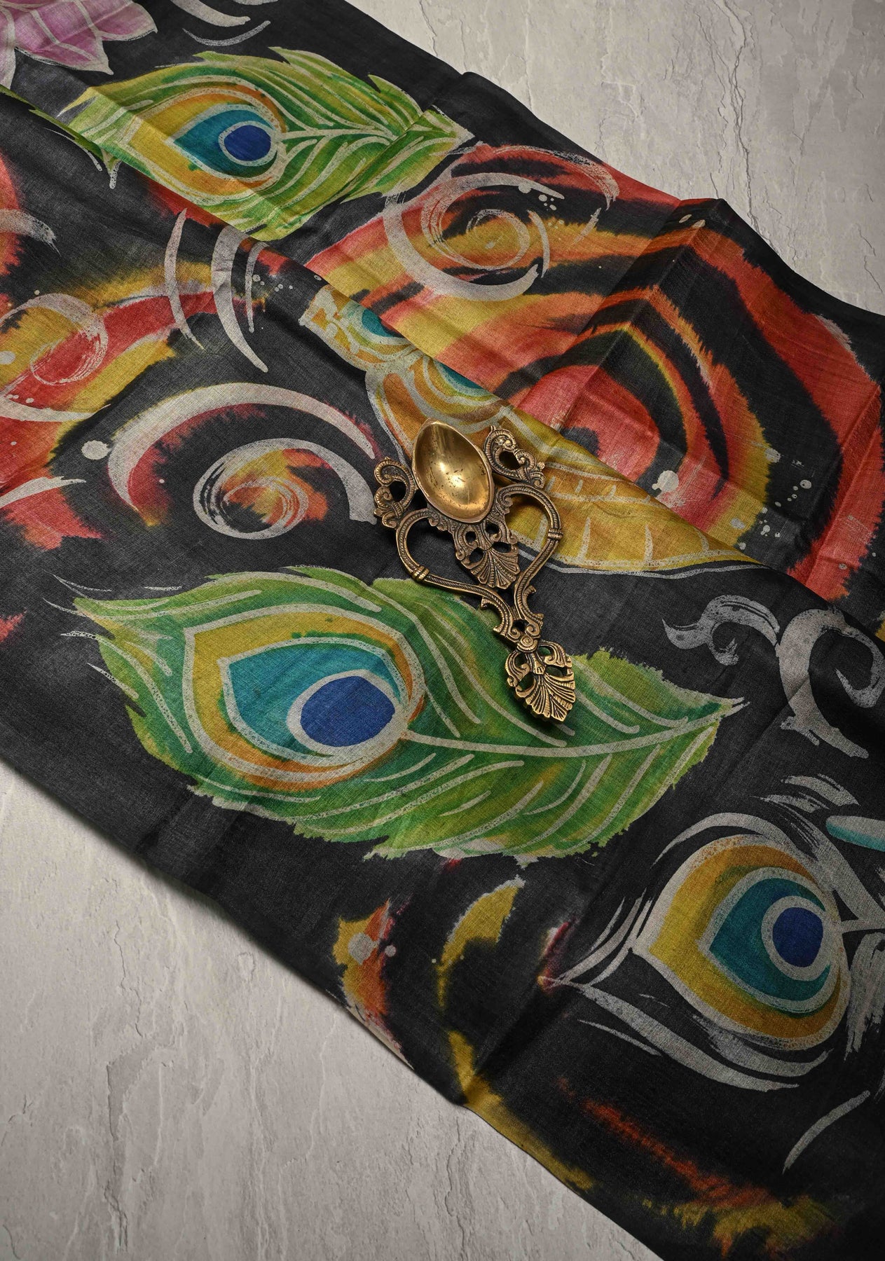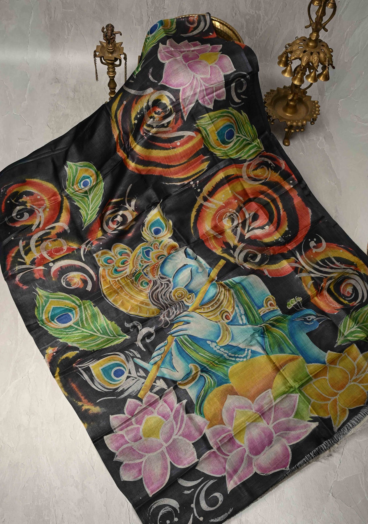 This Black Lightweight Tussar Silk Saree is a captivating blend of artistry and tradition, featuring exquisite hand wax batik printing. Crafted on rich, textured Tussar silk, the saree showcases a stunning depiction of Lord Krishna alongside symbolic peacock feather motifs — both rendered in intricate batik detail. The black base enhances the visual drama, while the natural sheen of Tussar adds elegance to every drape. Ideal for festive occasions, cultural events, or art-inspired gatherings, this saree is a wearable canvas that celebrates heritage, spirituality, and craftsmanship.