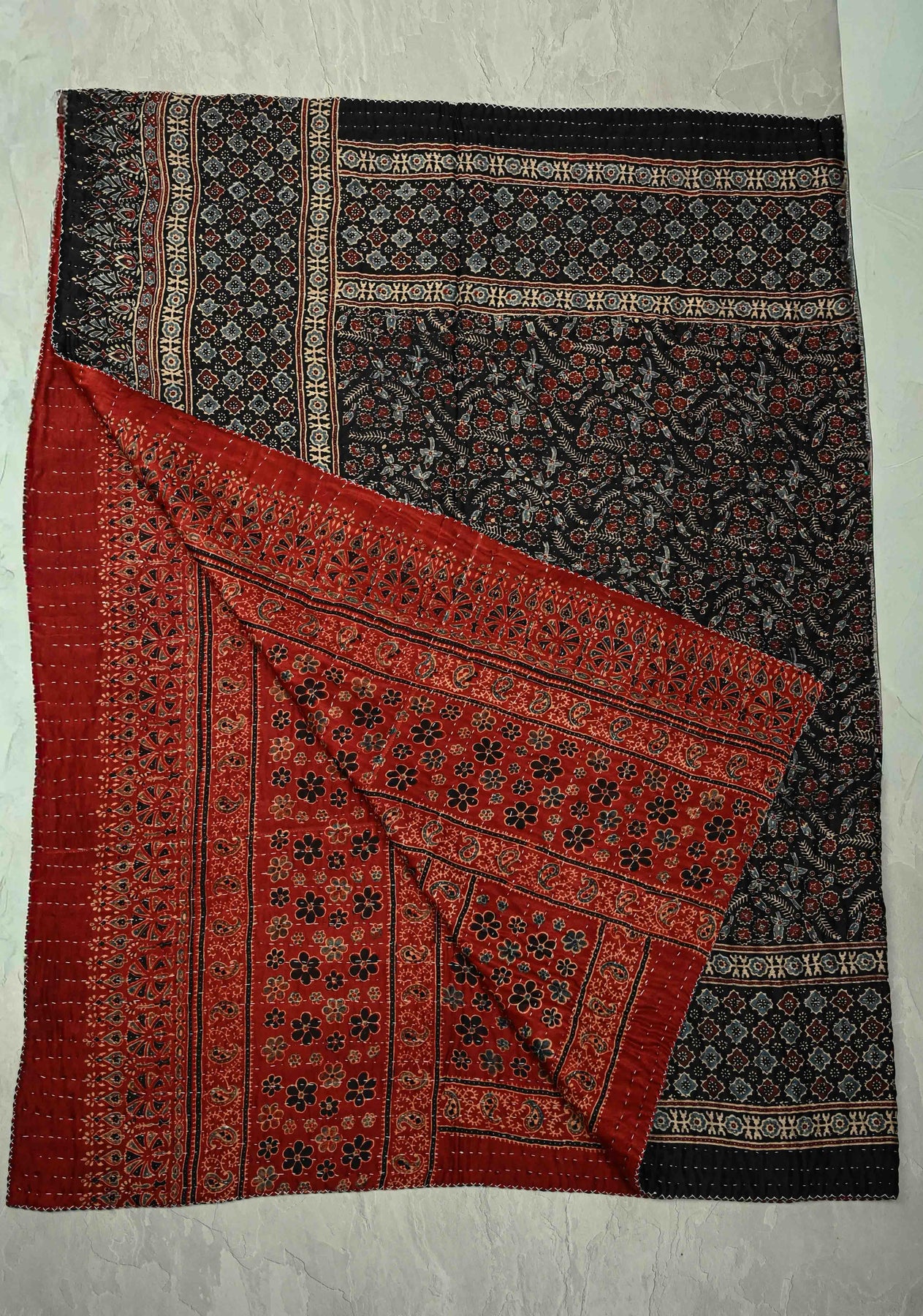 Gajji silk brings a beautifully smooth texture, soft sheen, and lightweight warmth, making this quilt ideal for both winter coziness and year-round comfort. The bold black and maroon palette paired with traditional Ajrakh motifs creates a striking visual appeal, while the intricate Kantha stitches add durability and artistic charm.