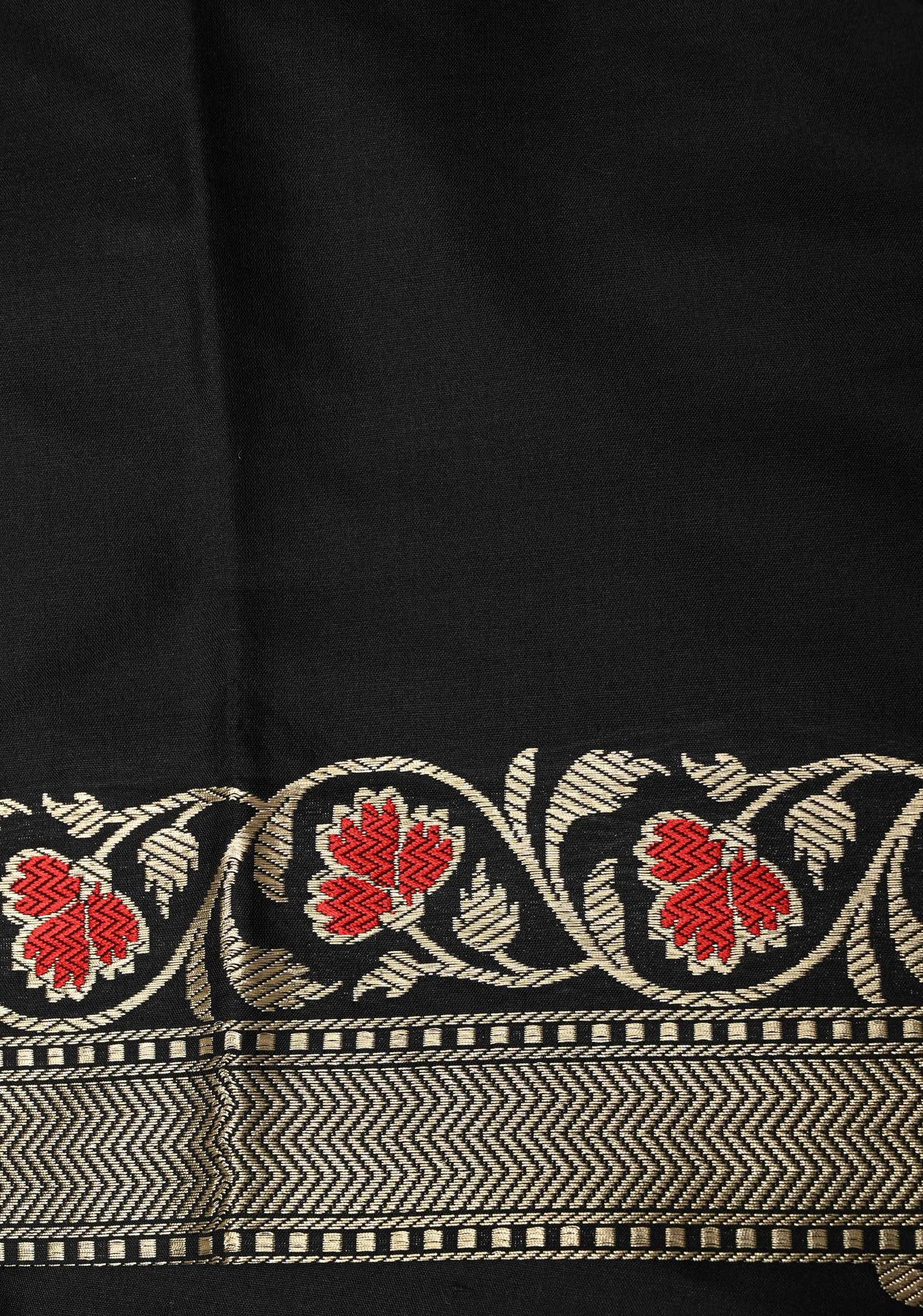 Scattered across the saree are graceful floral buttas, woven in fine zari threads that shimmer subtly against the deep black backdrop, enhancing the saree’s opulent appeal. The zari border and pallu further elevate the design with their intricate patterns, reflecting the unmatched craftsmanship of Banarasi weaving traditions.