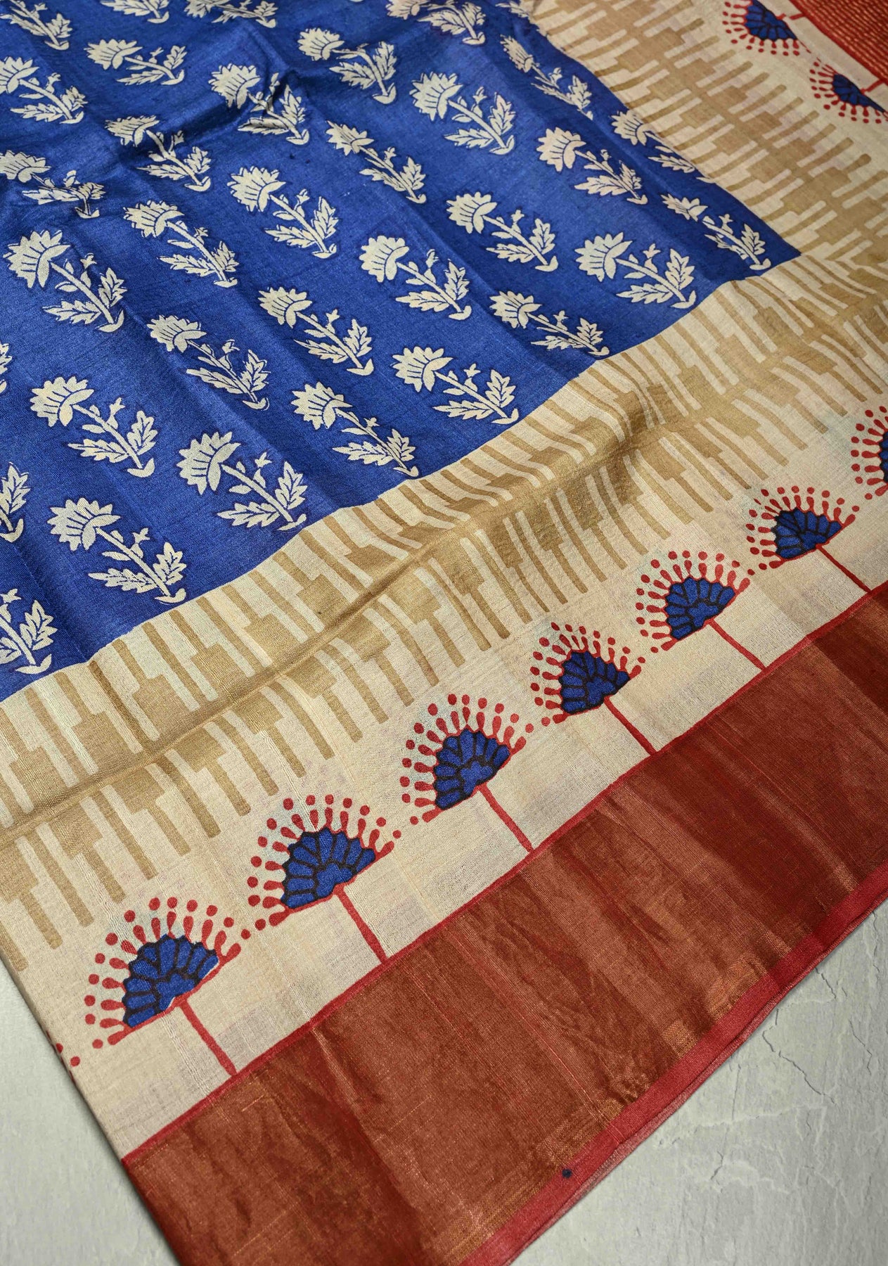 The Blue Pure Handloom Jari Tussar Silk Saree is an exquisite blend of traditional craftsmanship and modern elegance. Woven from Tussar silk, this saree features a rich blue base that exudes sophistication and charm. The body is beautifully adorned with intricate block prints, adding depth and character through delicate, handcrafted patterns. A striking panel design on the contrast zari border enhances its regal allure, offering a perfect balance of color and texture. Soft, lightweight, and gracefully lustrous, this saree drapes elegantly—ideal for festive occasions, weddings, and special celebrations.