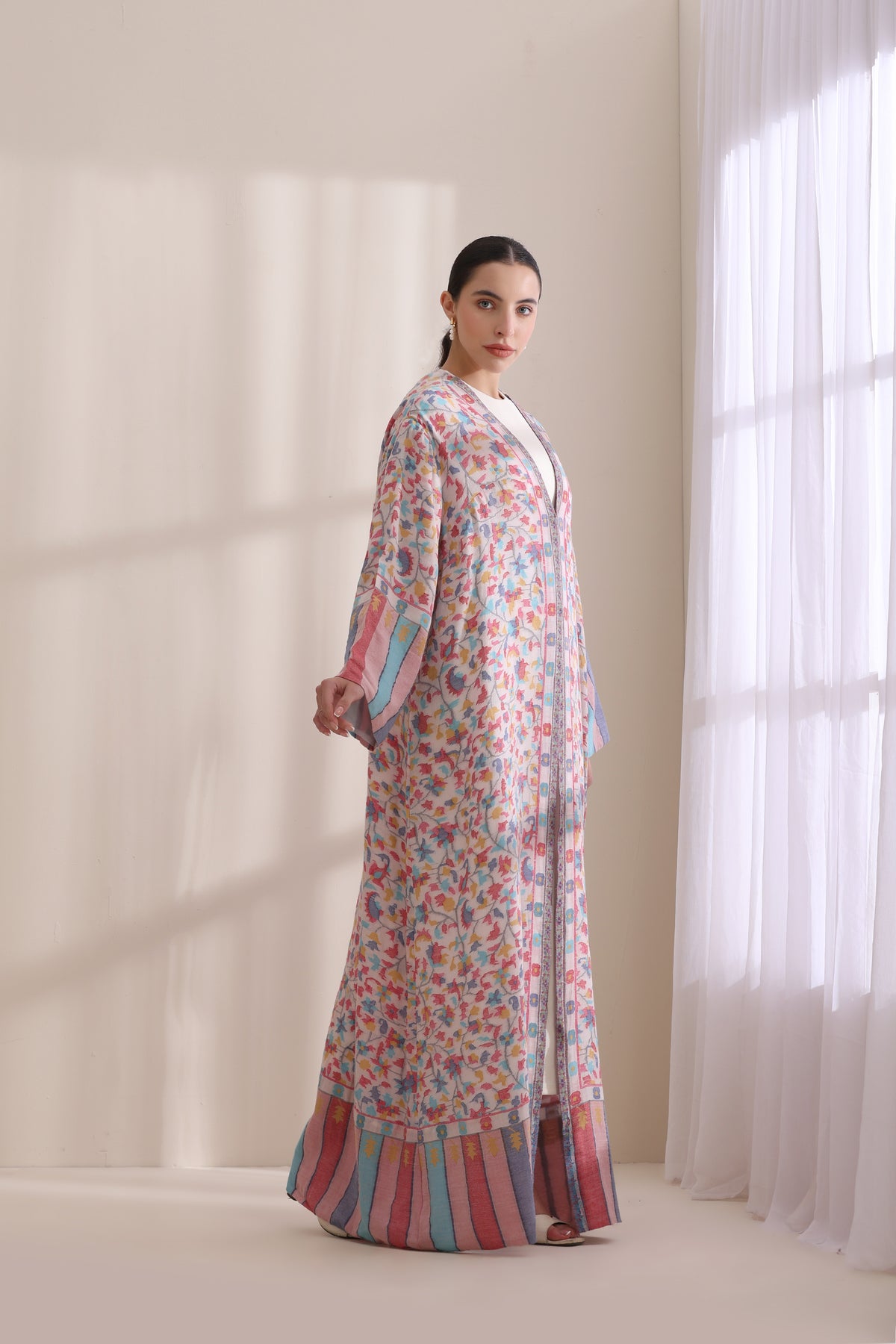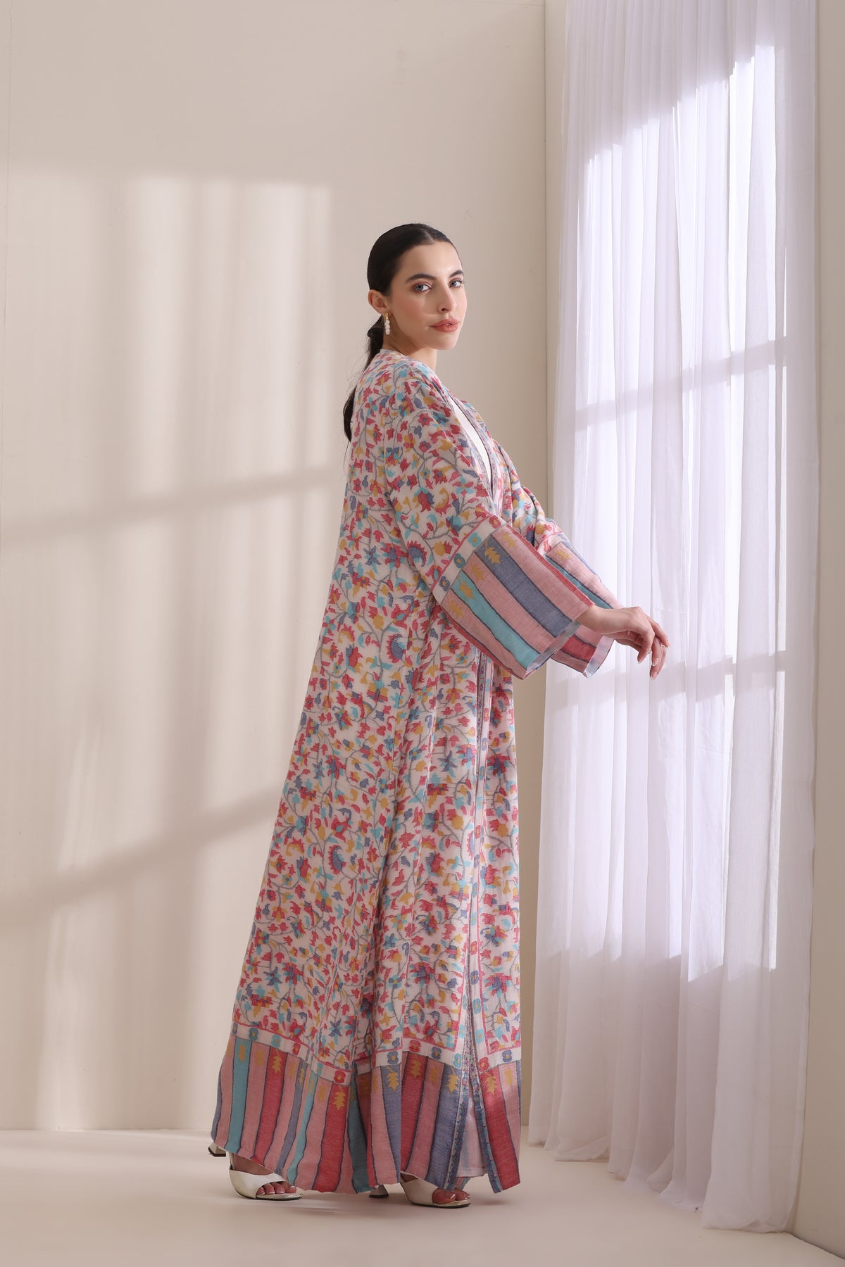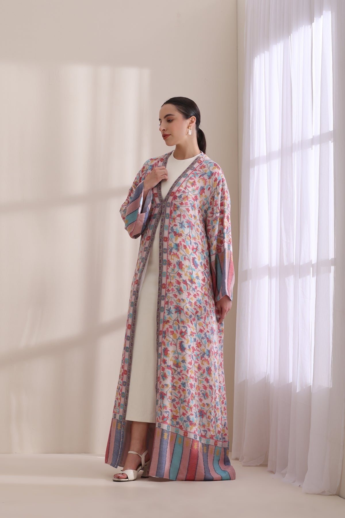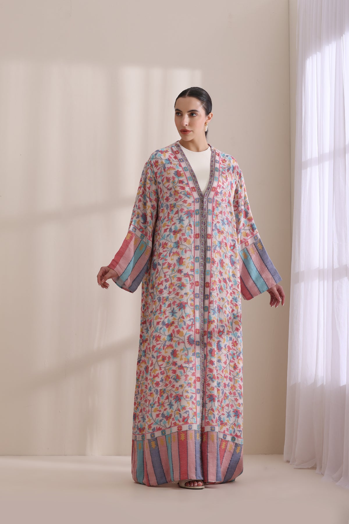 This luxurious Kashmiri Kani woven jacket is designed for the modern connoisseur of fine craftsmanship, blending traditional artistry with contemporary elegance. The full-length jacket features kani design age-old techniques from Kashmir. Crafted from premium wool, the jacket offers warmth, comfort, and a timeless appeal, making it a standout piece for winter wardrobes