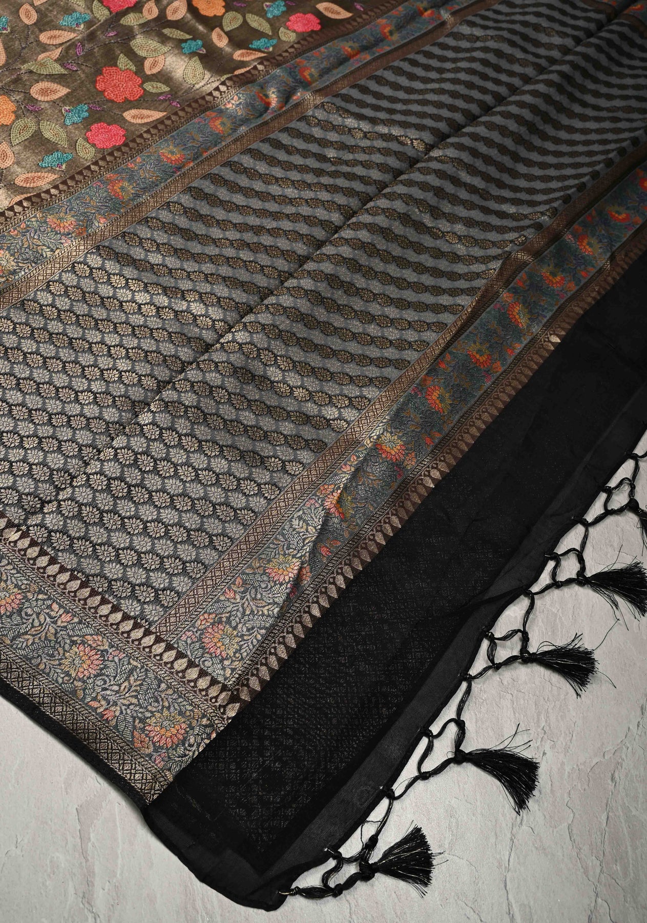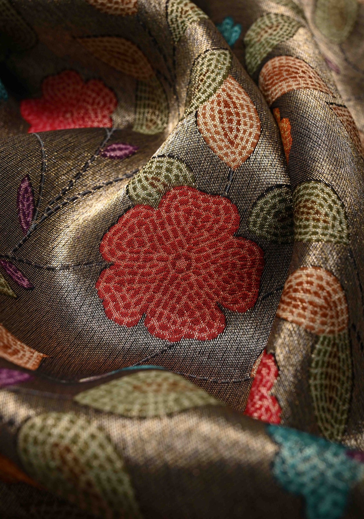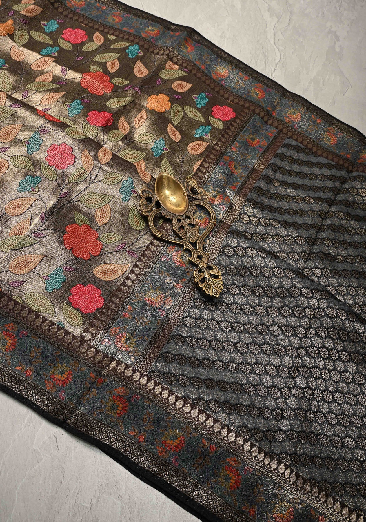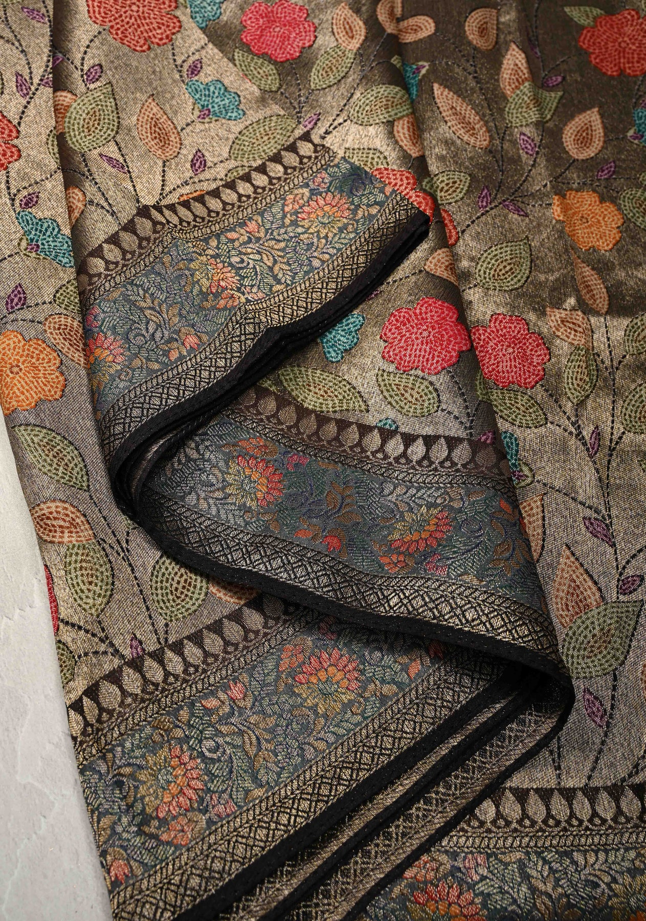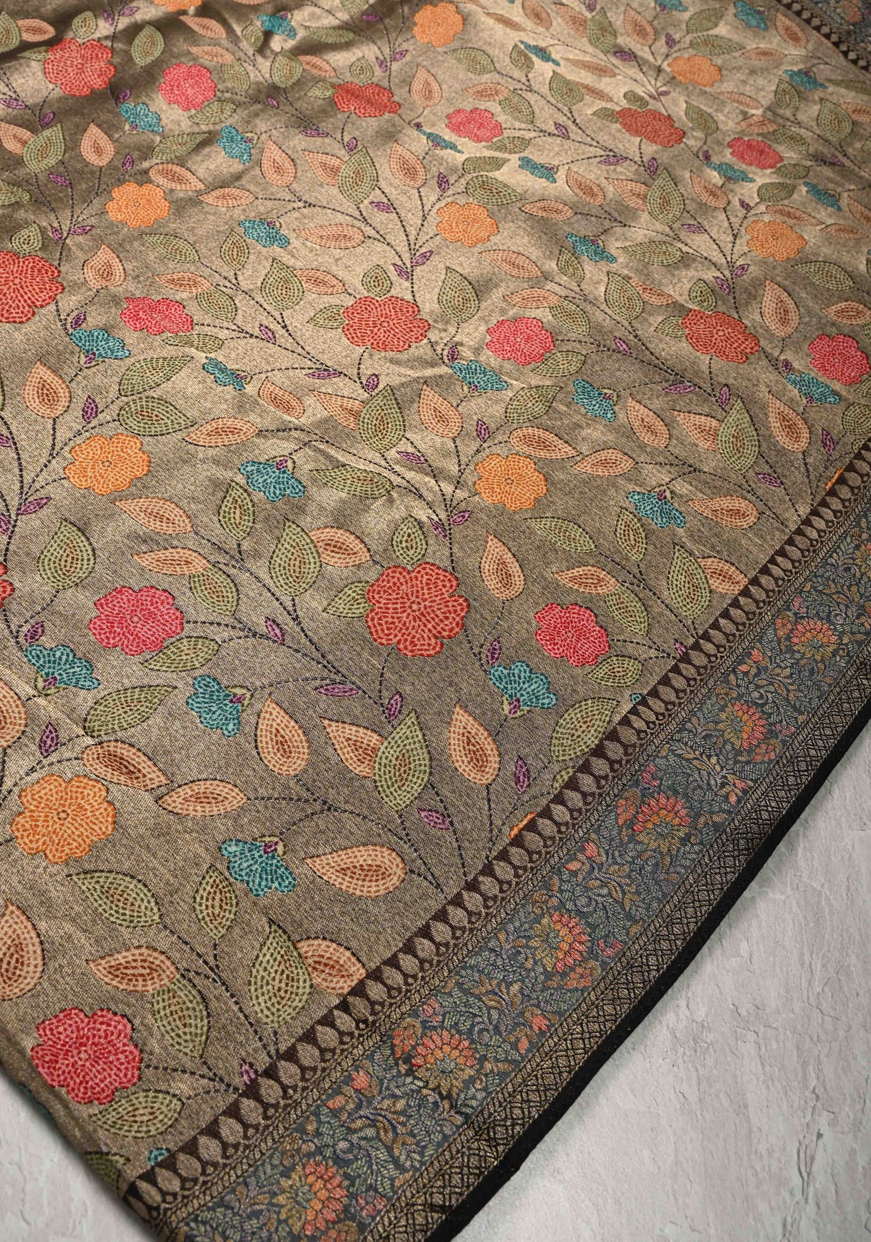 Radiate timeless elegance with this Brown Viscose Tissue Saree, adorned with a luxurious Meenakari floral jaal that exudes intricate craftsmanship. The shimmering zari border enhances the saree’s rich appeal, making it perfect for weddings, festive occasions, and grand celebrations. The soft tissue texture adds a graceful sheen, ensuring you look effortlessly regal.