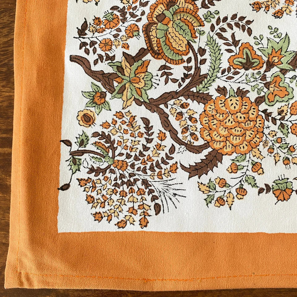 The design captures the essence of nature through a stunning colour palette - delicate sky blue as the base adorned with warm terracotta orange florals, rich brown branches, and subtle mint green leaves. The central pattern displays beautifully detailed floral medallions interconnected by flowing vines and smaller blooms, creating a harmonious garden-inspired layout. Each placemat is framed with a sophisticated terracotta orange border that perfectly complements the intricate central design.