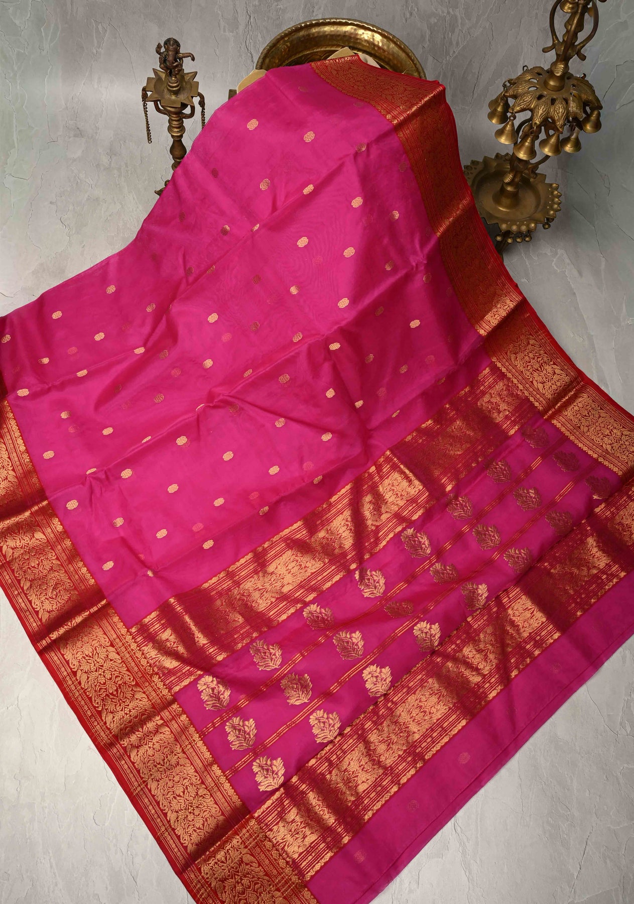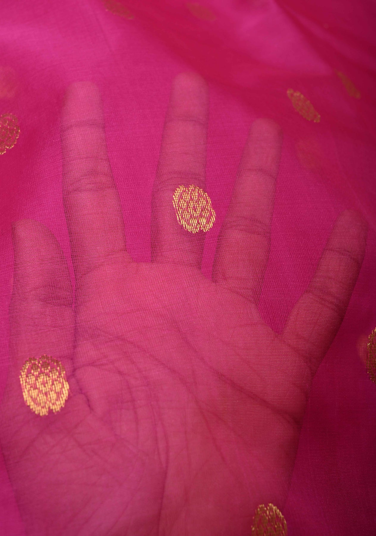 This Fuchsia Chanderi Silk Saree is a vibrant celebration of traditional elegance and lightweight luxury. Crafted in the fine weaving tradition of Chanderi, the saree features a lustrous silk texture that drapes effortlessly. Gleaming zari buttas are delicately woven across the body, adding a touch of shimmer and festive charm. The fuchsia base is beautifully complemented by classic zari borders that lend a regal finish. Perfect for festive occasions, family functions, or cultural gatherings, this saree brings together bold color, intricate detailing, and timeless grace.