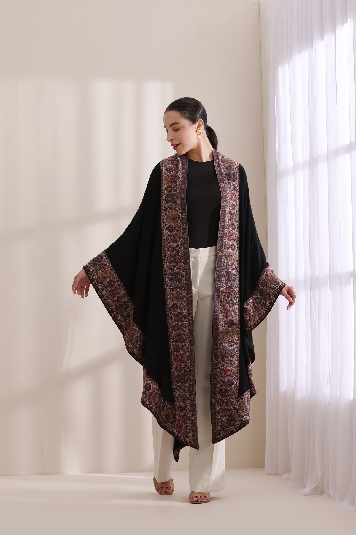Chitra woven cape is an elegant black draped garment featuring intricate woven borders inspired by traditional motifs. Soft, flowing fabric creates a luxurious silhouette, perfect for layering over both eastern and western ensembles. This versatile piece seamlessly blends heritage craftsmanship with contemporary style, making it ideal for upscale occasions and distinctive daily wear