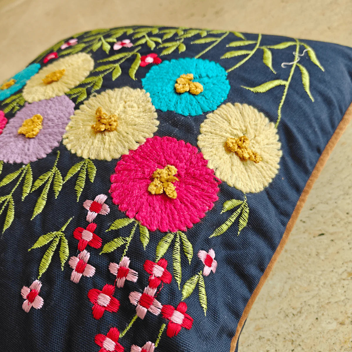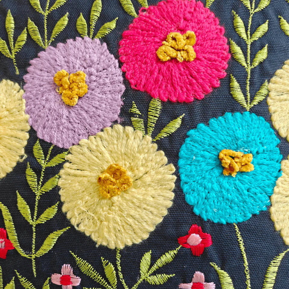 Bring home a touch of vibrant artistry with the Elara Cushion Cover. Crafted from 100% cotton in a rich navy base, this premium embroidered cover is designed to be a bold yet elegant accent for your living space.