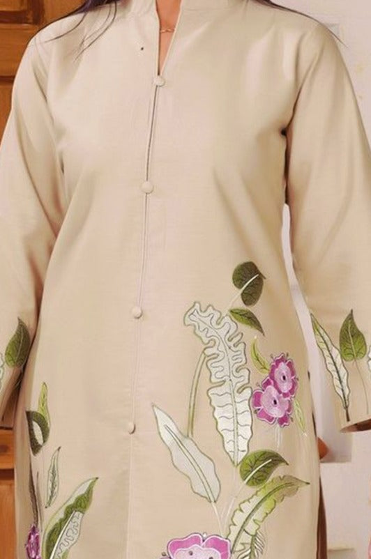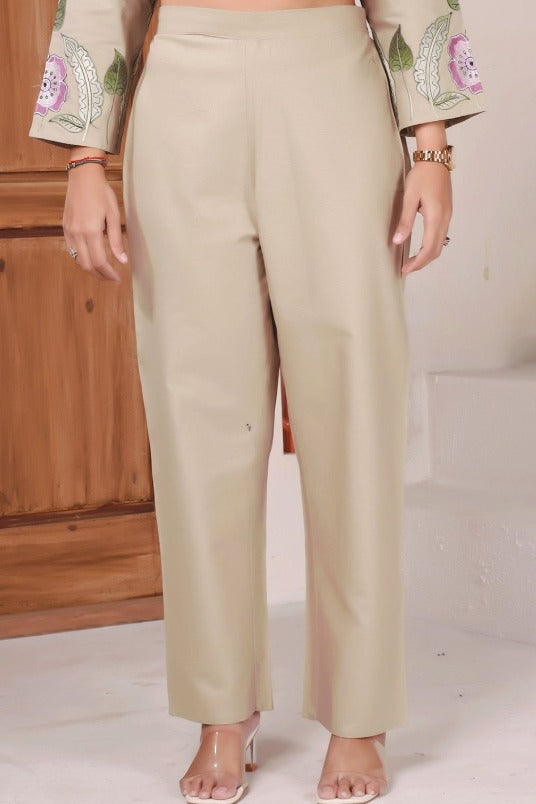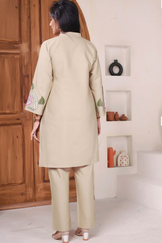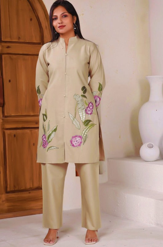 Subtle yet striking, this beige co-ord set features a beautifully embroidered tunic in shades of pink and green. Designed with a mandarin collar, long sleeves, and button closure, it exudes refined elegance. Paired with solid beige mid-rise trousers featuring a straight hem and slip-on closure, this ensemble blends sophistication with all-day comfort, perfect for brunches, celebrations, or work gatherings.