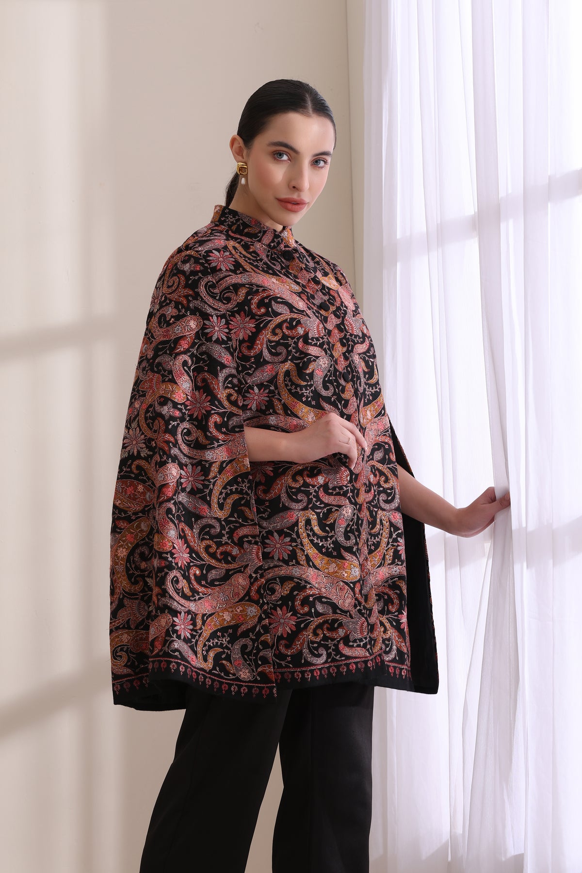 The Emery embroidered cape features exquisite floral motifs in vibrant red and multicolor threads on a black base. Tailored with a structured silhouette and front button closure, this statement piece blends traditional craftsmanship with modern elegance, making it perfect for festive occasions or elegant evenings. A timeless luxury addition.