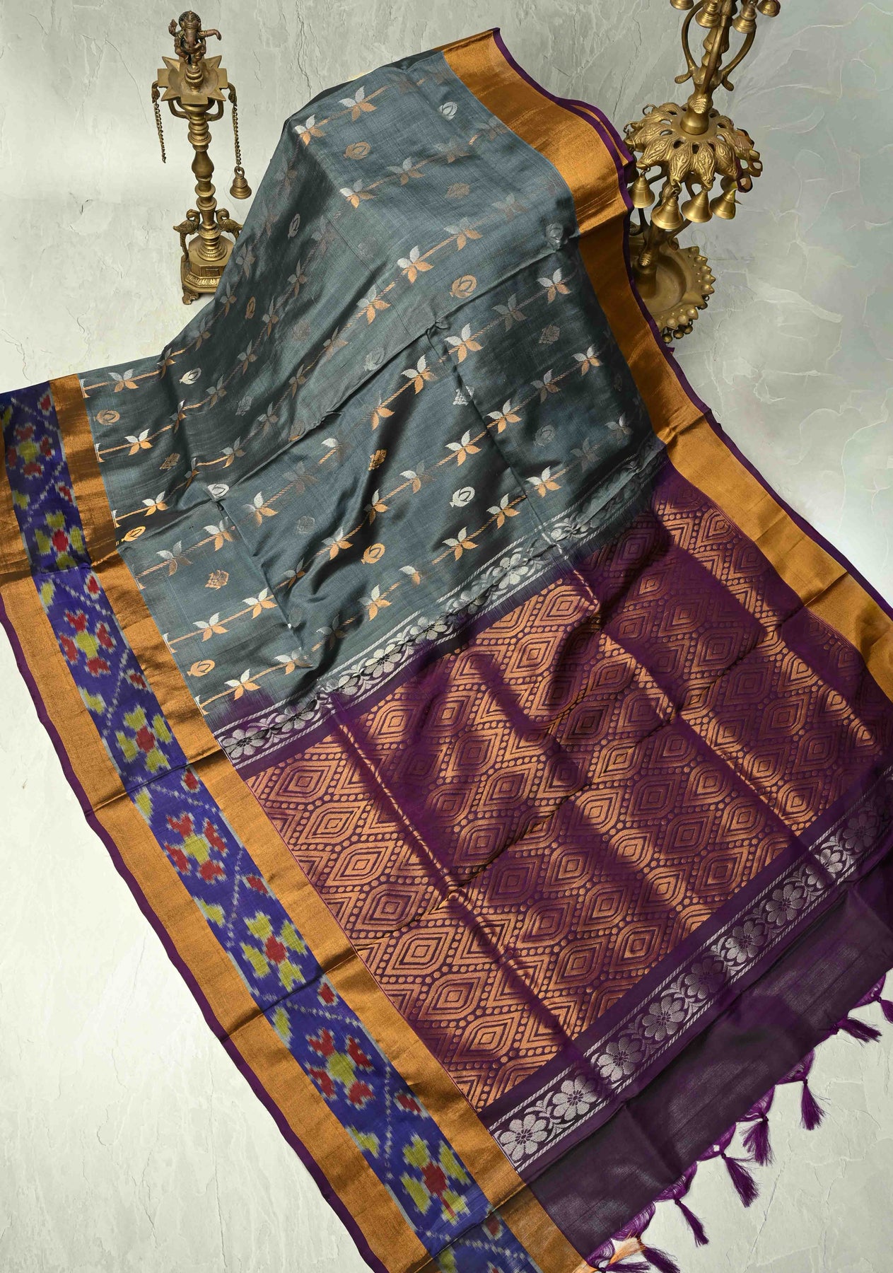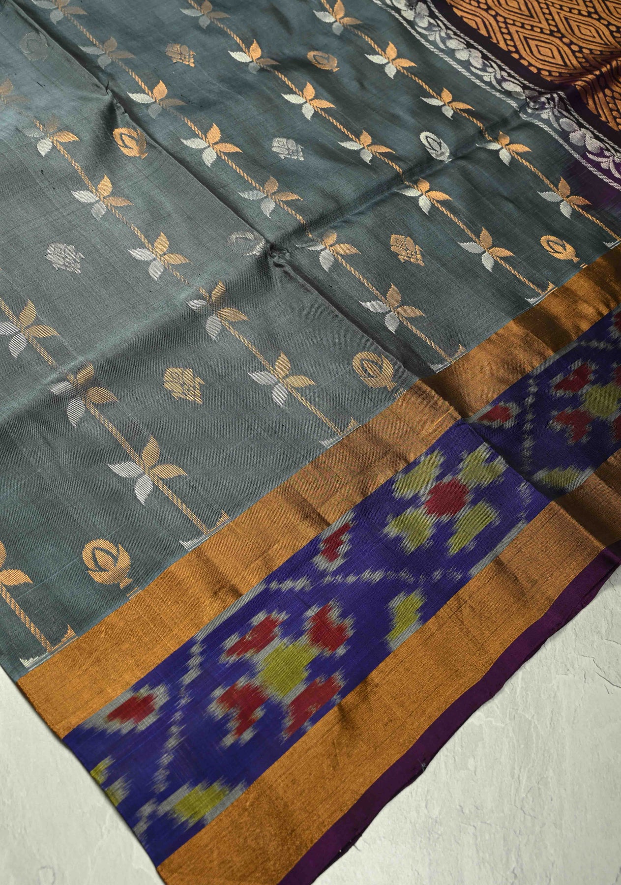 Exquisite Gray Uppada Handloom Silk Saree with Gold Silver Zari Stripes Buttas and Ikkat Border | SILK MARK CERTIFIED
