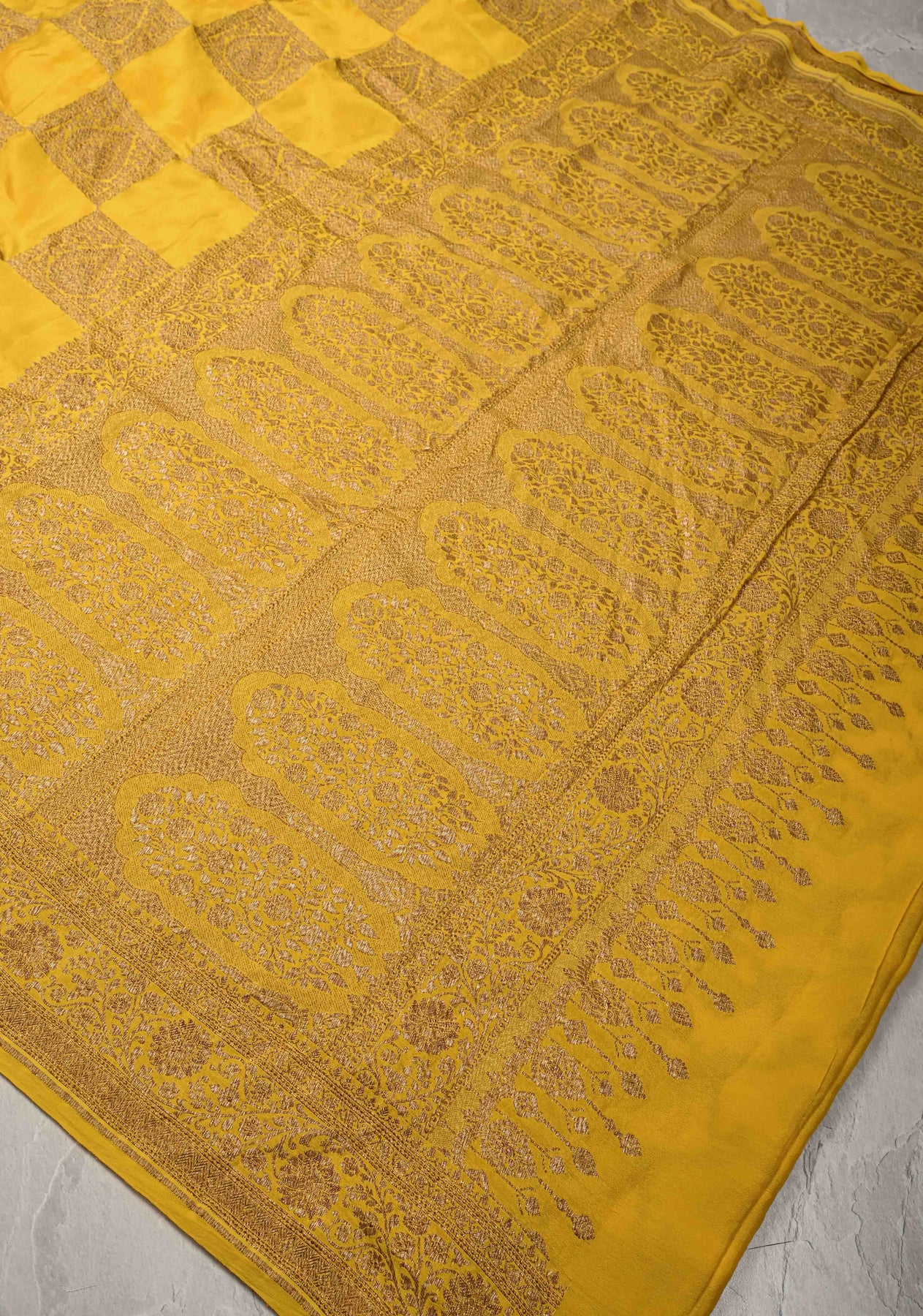 This Exquisite Yellow Banarasi Georgette Silk Saree is a perfect blend of traditional heritage and graceful elegance. Adorned with the timeless Geometric pattern, the saree features classic checkered zari lines interlaced with traditional motifs, symbolizing cultural richness. Crafted from georgette silk, it drapes effortlessly, offering both comfort and sophistication. The shimmering zari border adds a regal touch, enhancing its festive appeal. Ideal for weddings, religious functions, and celebratory occasions, this saree is a radiant expression of Banarasi craftsmanship and enduring style.